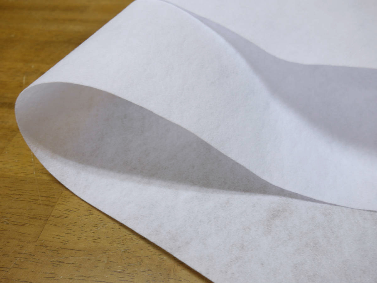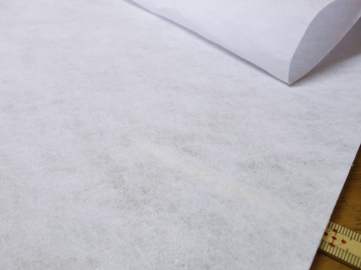 ポリエステル100%、不織布(経糸横糸で織られた生地ではなく和紙のようなもの)の裏面にのりが付いたアイロン片面の接着芯地で、厚地ハードタイプのしっかりめの仕上がり感でございます。