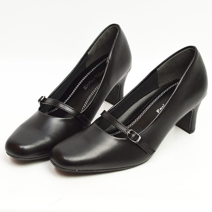 パンプス レディース 6.5cm ヒール 高め 幅広 3E スクエアトゥ ストラップ 通勤 オフィス ブラック【エコ配送】 87145