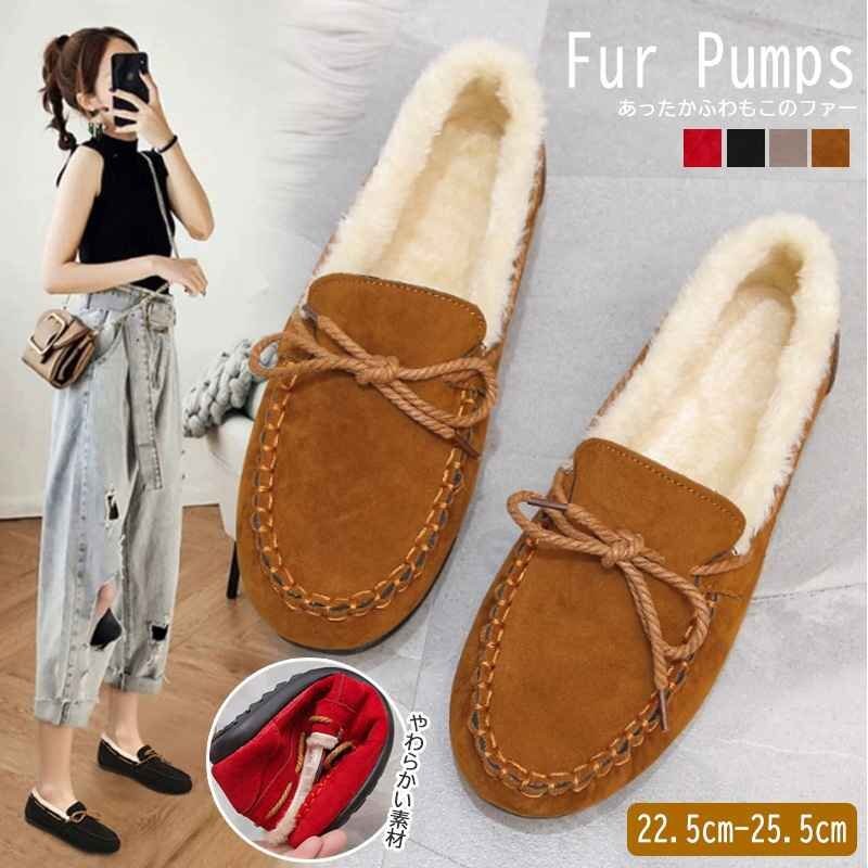 ・丸みのあるころんとしたデザインともこもこファー素材感が可愛いパンプス。