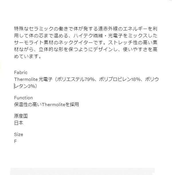 特殊なセラミックの働きで体が発する遠赤外線のエネルギーを利用して体の芯まで温める、ハイテク繊維・光電子をミックスしたサーモライト素材のネックゲイターです。