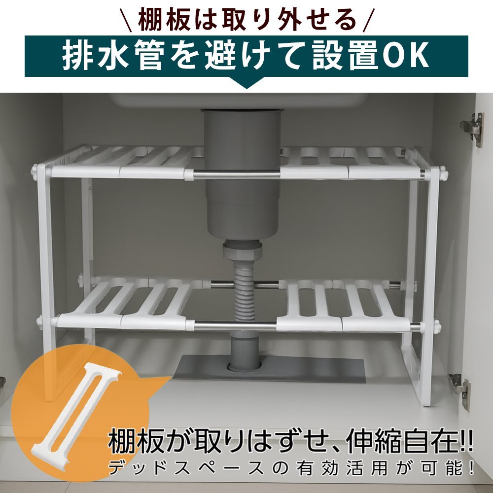 | デッドスペースを有効活用! 棚板が取りはずせる、伸縮自在のシンク下ラック。 ごちゃつきがちなシンク下を、スッキリ見やすく整理整頓できます。 ■ 工具不要で簡単組立 ネジパーツで止めるだけ! 誰でも簡単に組み立てられます。 ■ 伸縮自在 シンク下のサイズに合わせて自由に調節可能。 本体幅は約39~66cmに対応! ■ 高さ調節可能 差し込み位置を変えるだけで、棚の高さをお好みに調整できます。 ■ 排水管を避けて設置OK 棚板を取り外せるので、排水管をよけて設置できます。 ■ 棚板はサッと取り外し可能 掃除や配置替えの際もラクラク。 |