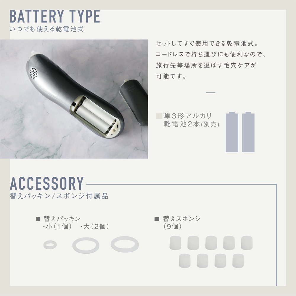 | 付属品 | 吸引カップ3種(丸型大・丸型小・楕円型) 替えパッキン(小×1・大×2) 替えスポンジ(9個) |