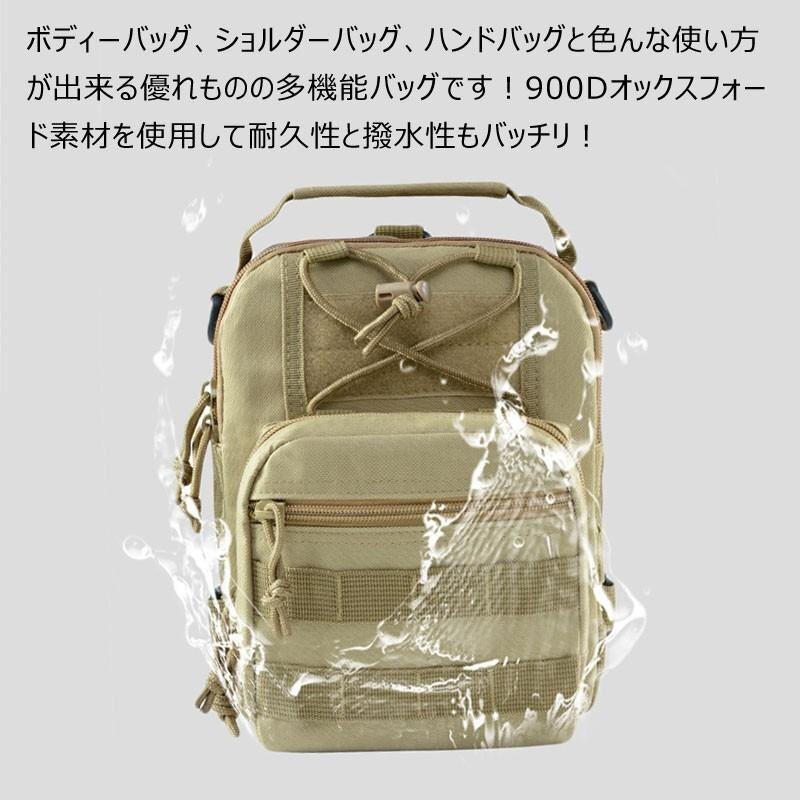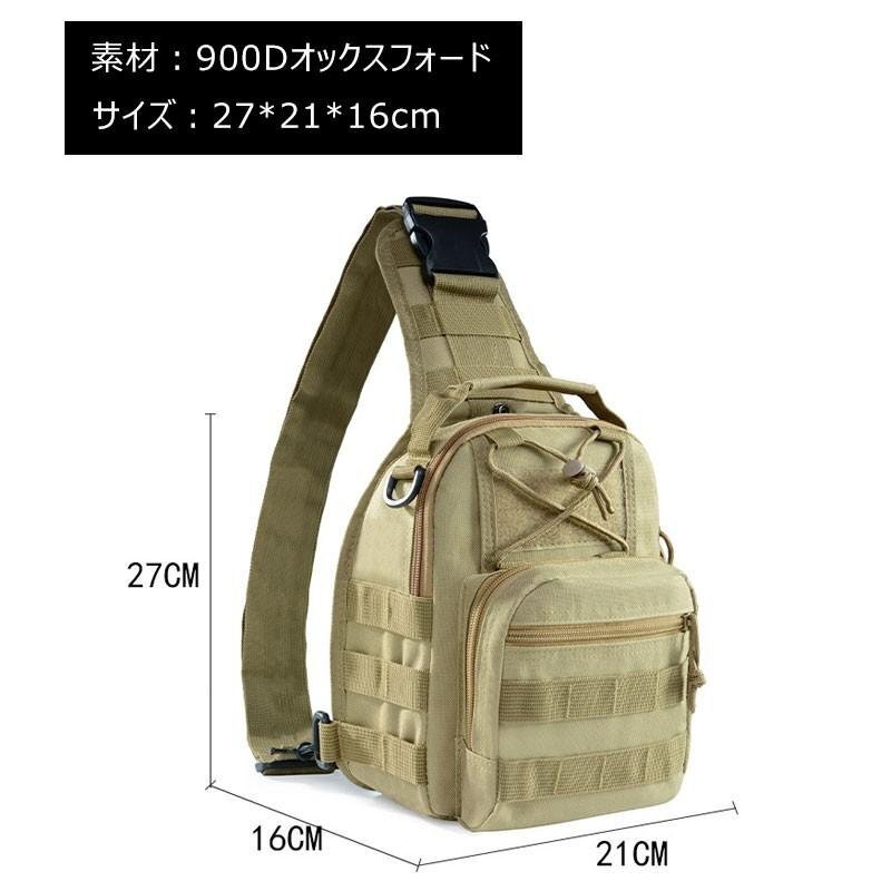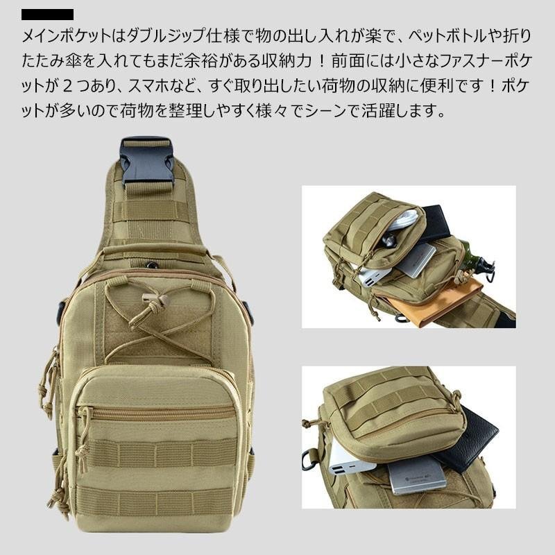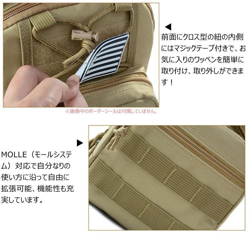 900Dオックスフォード素材を使用して耐久性と撥水性もバッチリ!メインポケットはダブルジップ仕様で物の出し入れが楽で、ペットボトルや折りたたみ傘を入れてもまだ余裕がある収納力!前面には小さなファスナーポケットが2つあり、スマホなど、すぐ取り出したい荷物の収納に便利です!前面にクロス型の紐の内側にはマジックテープ付きで、お気に入りのワッペンを簡単に取り付け、取り外しができます! バッグ上部には持ち手付き!MOLLE(モールシステム)対応で自分なりの使い方に沿って自由に拡張可能、機能性も充実しています。バッグ本体の背面には通気性良い素材を採用し、体への負担を軽減します!長さを調整できるショルダーのベルトは左右どちらでも装着可能!ワンタッチ式バックルで着脱もカンタン。また、ベルト部分をバッグ本体の背面へ収納することによりコンパクトなハンドバッグとしても活躍してくれます。