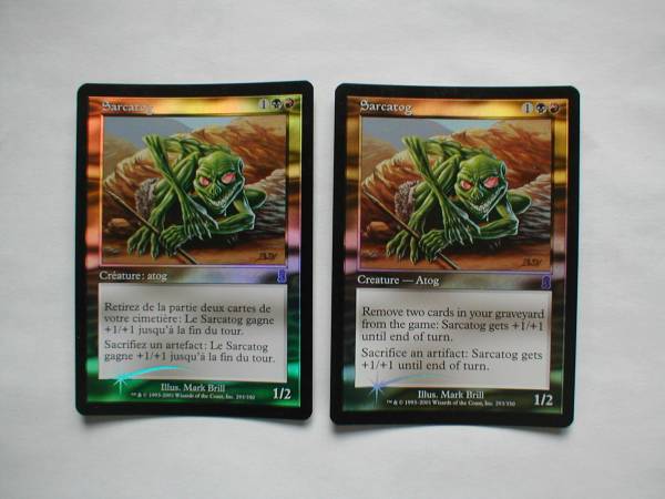 B知人の委託品です。 画像が全てです。 MTG サルカトグ/Sarcatog foil 英語2枚です。 何語だか分らない時があります。 エキスパンション、外国語(言葉)は画像で確認をお願いします。 カードはプレイしてます。 程度はカードに目立つ擦り傷、傷、シワ、折れ目、ペン跡のようなキズ、汚れ、角や端に傷、黒枠にキズ、などのキズが結構あります。 カードからタバコ、香水の匂いがします。 カードが丸まっていたり反ってたりしています。 気が付かない部分がありますので程度を気にする方は入札をご遠慮下さい。 程度は下、ボロです。 コレクションには向きません。 何か起きた場合には自分では対応が出来ませんのでご理解頂ける方のみ入札をお願いします。 普通郵便、クロネコメール便で発送します。 郵便事故や郵便破損が起きた場合には保障できません。 ノ-クレーム、ノーリターンでお願いします。