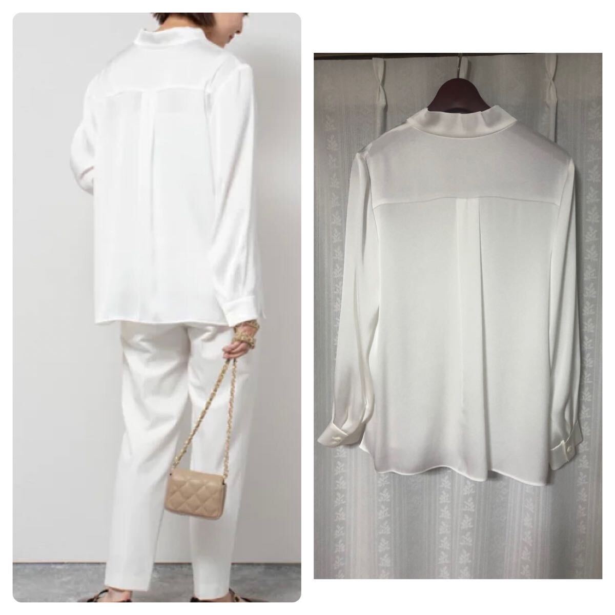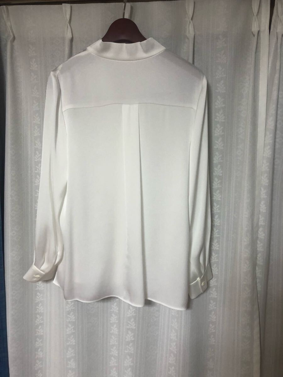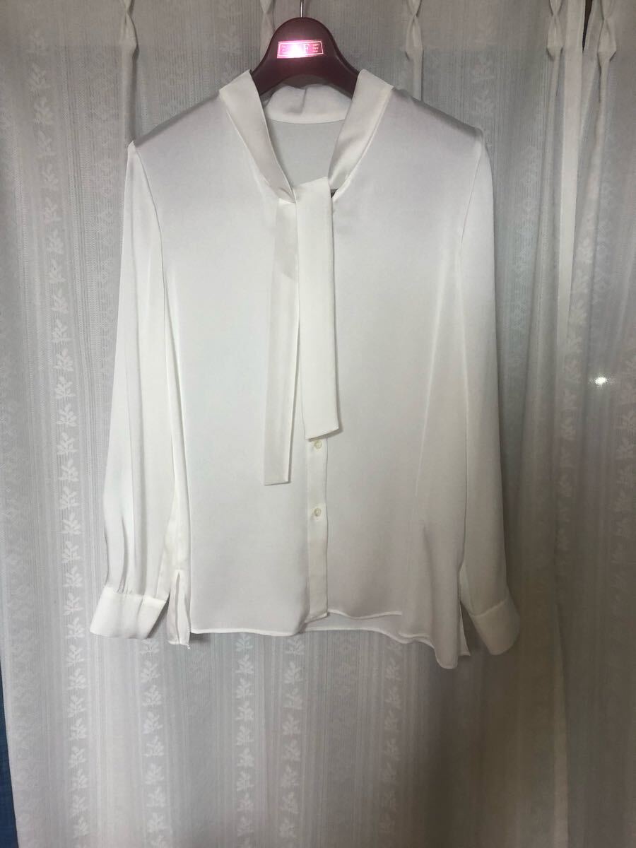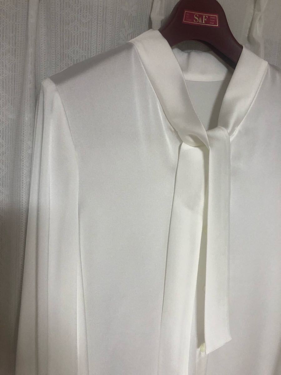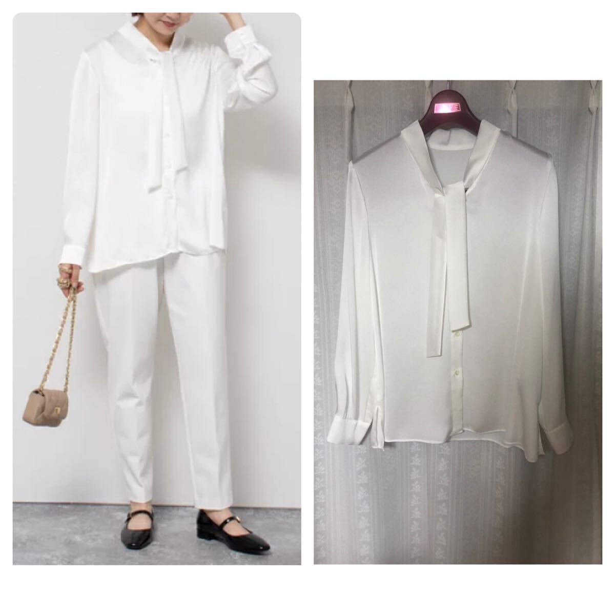 ライトな素材の微光沢バックジョーゼットサテンを使用したボウタイブラウス。