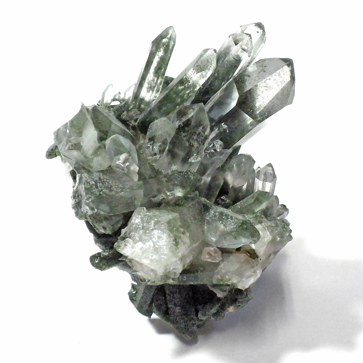 コロンビア産のクローダイトインクォーツ、クラスターです。透明度の高いクォーツの中に、美しく深みのある緑色のクローダイト(緑泥石)が内包された、非常に希少で魅力的なクラスター標本です。産地は美しい鉱物で知られる南米・コロンビア。自然が長い年月をかけて育んだ神秘的な鉱物アートは、コレクターのみならず、癒しや浄化を求める方にも人気があります。