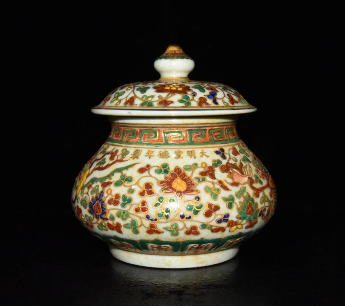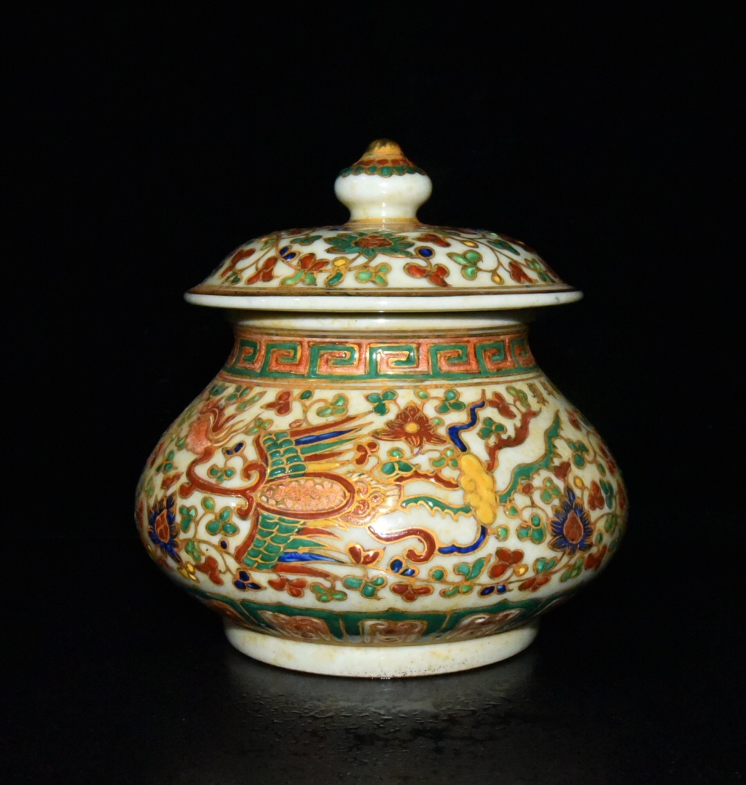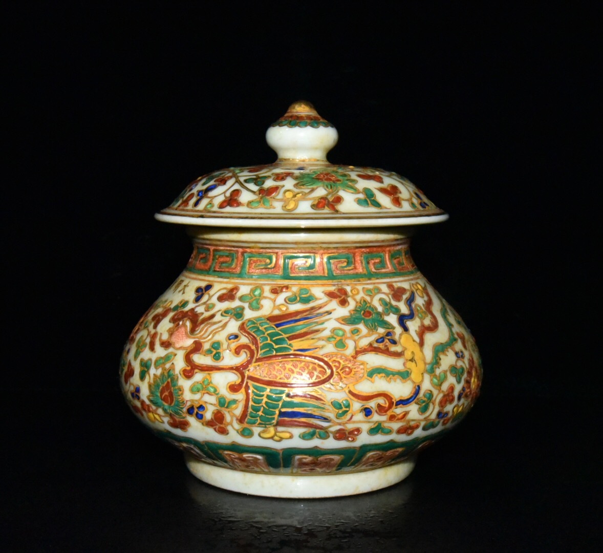 【超珍館蔵】明 宣德年製款 古陶瓷品 五彩 描金 鳳紋 蓋罐 置物 古賞物 古美術品 稀少珍蔵品