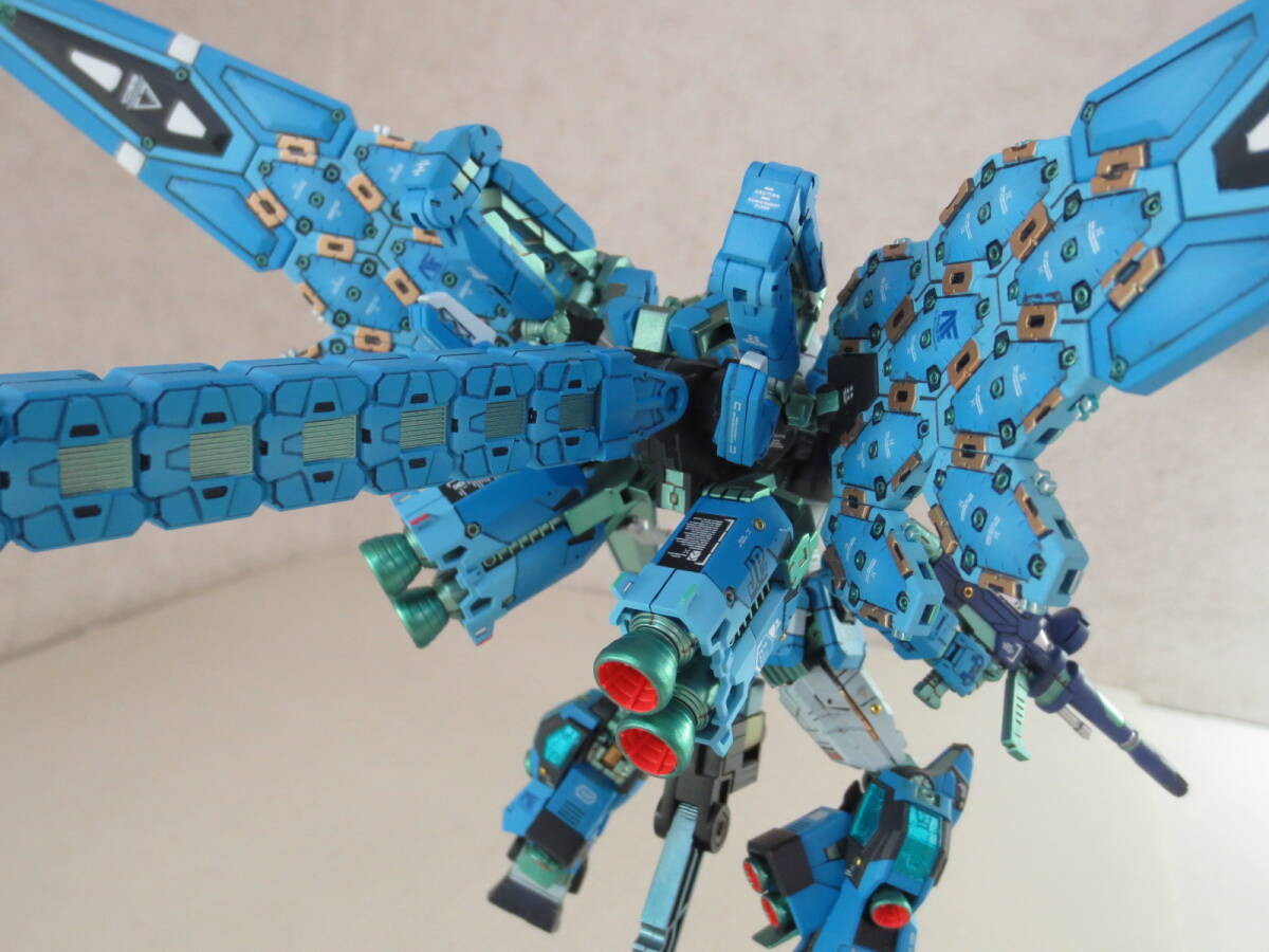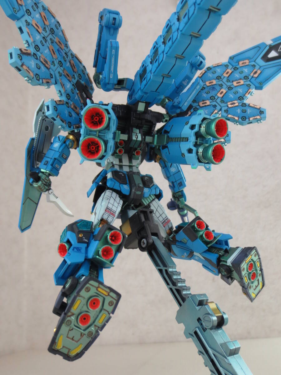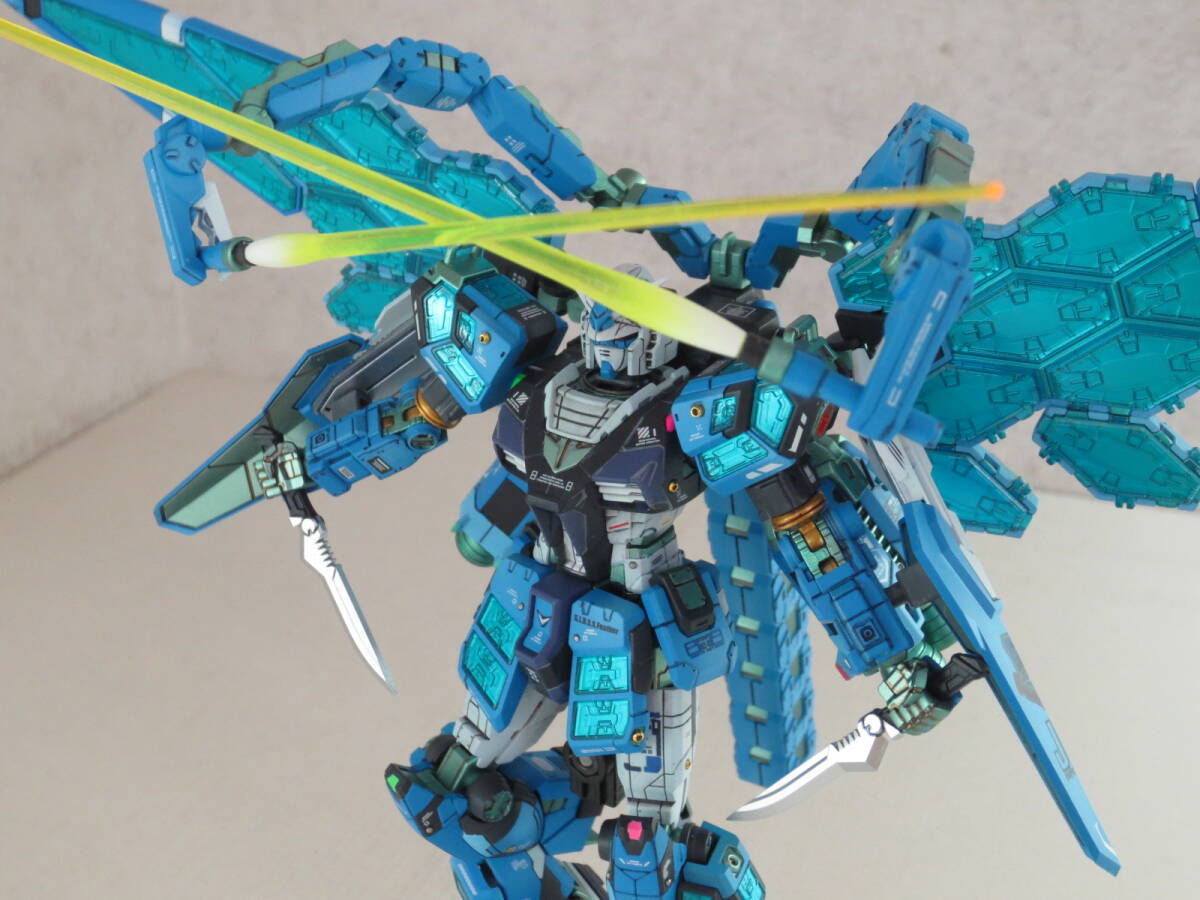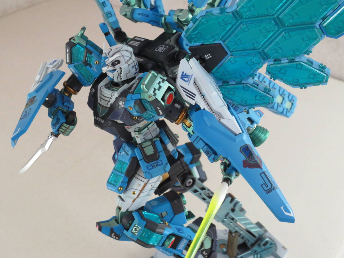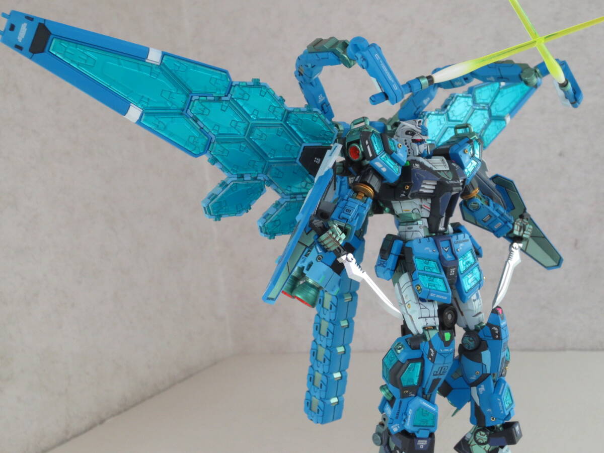 グラスフェザーの透明パーツの発色は、製品仕様だとクリアーパーツのはまる内側に銀色のホイルシールをペタペタ敷き詰めていくことになっていますが、この貼り付け作業はウイングの中空ガタガタ構造の穴塞ぎなのでデコボコになるのが目に見えており(※前例 HGUC1/144バンシィ)、なによりシールだのみで作ることはド素人感がありみっともなさすぎる行為ですので、モデラー観点からシールなしで全塗装。 具体的にはまず光の反射となる裏面をメタリックマスター(メタル溶剤です)でよく伸ばしたシルバーで塗装。このクリアーパーツはどれも内側にはいるパーツの裏面にも表から透過して目視できる造形があり、これを見えやすくできるよう非透過色のシルバーで浮き立たせて見えるように。 そしてクリアーの表側からは蛍光ブルーを主体とした光沢コーティング塗装をおこなっています。、
