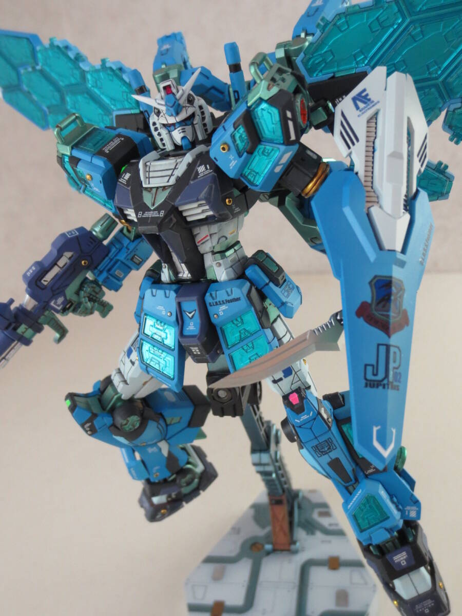 今回この作例においては「ジョニーライデンの帰還」リスペクトの創作としてユーマ・ライトニング専用機のカラーリング&追加装備のコンポジットプレートユニットにて演出。 かの作品のラストもまた某ガンダム作品を踏襲するように、戦いが終わったのちに木星船団で地球圏から旅立つ ~というスペースノイドとして希望に満ちた足跡の絶ちかたをしてくれたので、一読者としてその未来を深読みした作例に仕上げました。 考察としては、ジュピトリス型巨大往還船にて運用されるガンダムタイプ。グラスフェザーを装備したその機体にFSSやらユーマ・ライトニングのエンブレムがあれば、彼らが最終回のその先でも元気にやっているのを想像してしまうというもので。