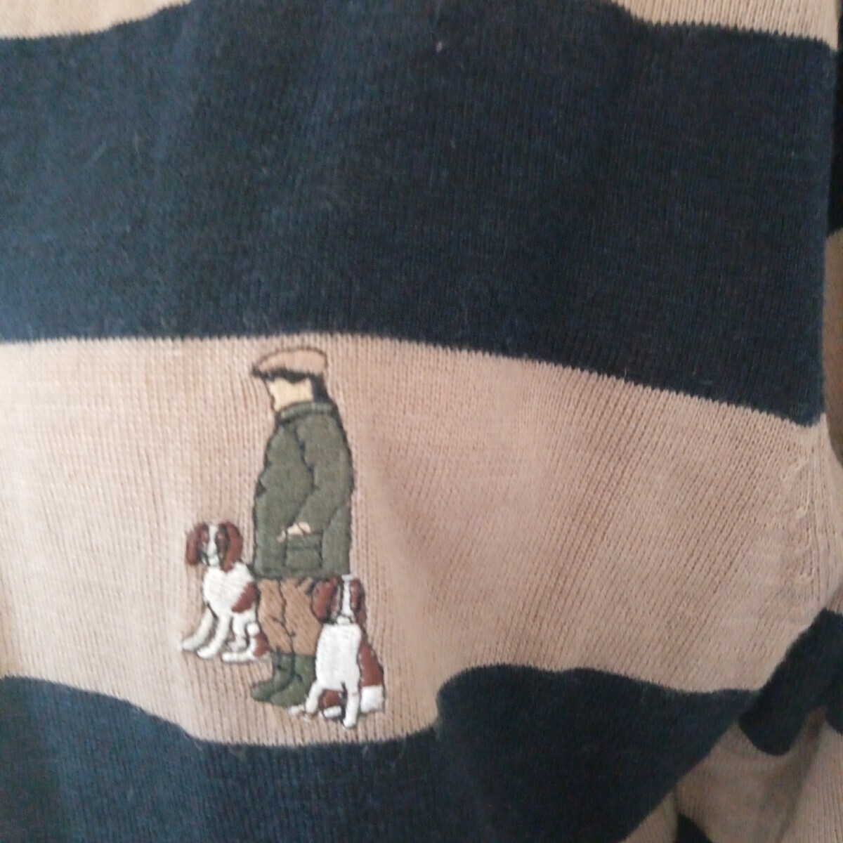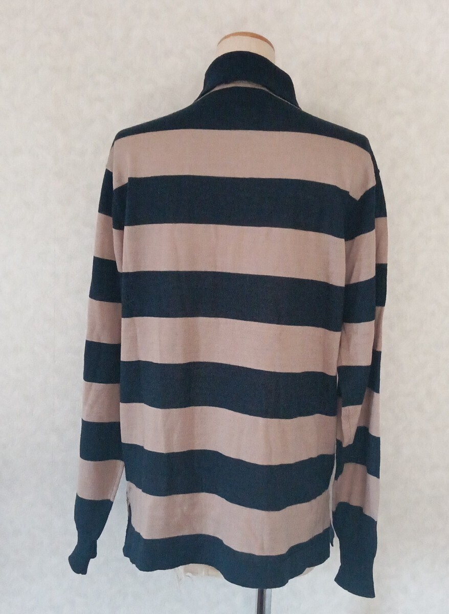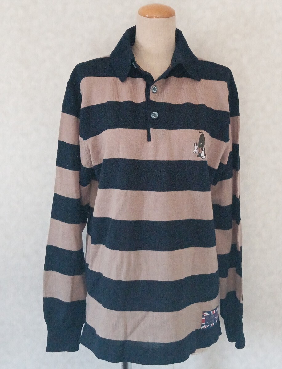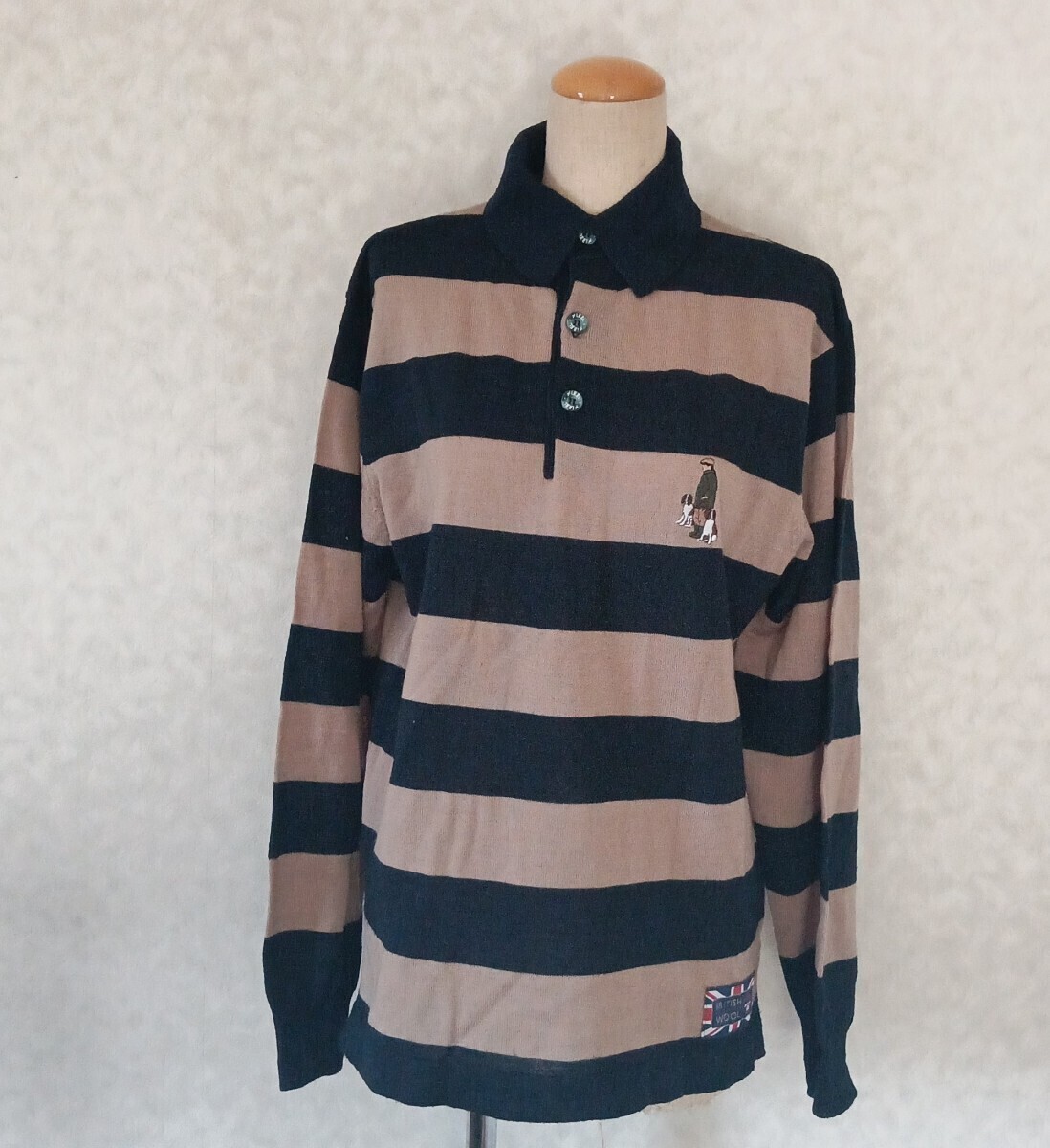 ネイビーとベージュのボーダーデザインの長袖ポロシャツ、胸元に刺繍のロゴ付き。