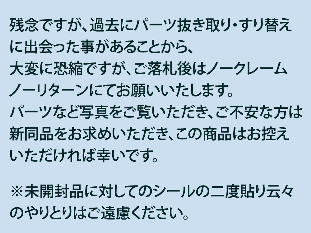 残念ですが、パーツ抜き取り・すり替えに出会ったことがあることから、大変に恐縮ですがご落札後はノークレームノーリターンにてお願いいたします。パーツなど写真をご覧いただき、ご不安な方は新同品をお求めいただきお控えいただければ幸いです。★★★未開封品に対してのシールの二度貼り云々のやりとりはご遠慮ください。