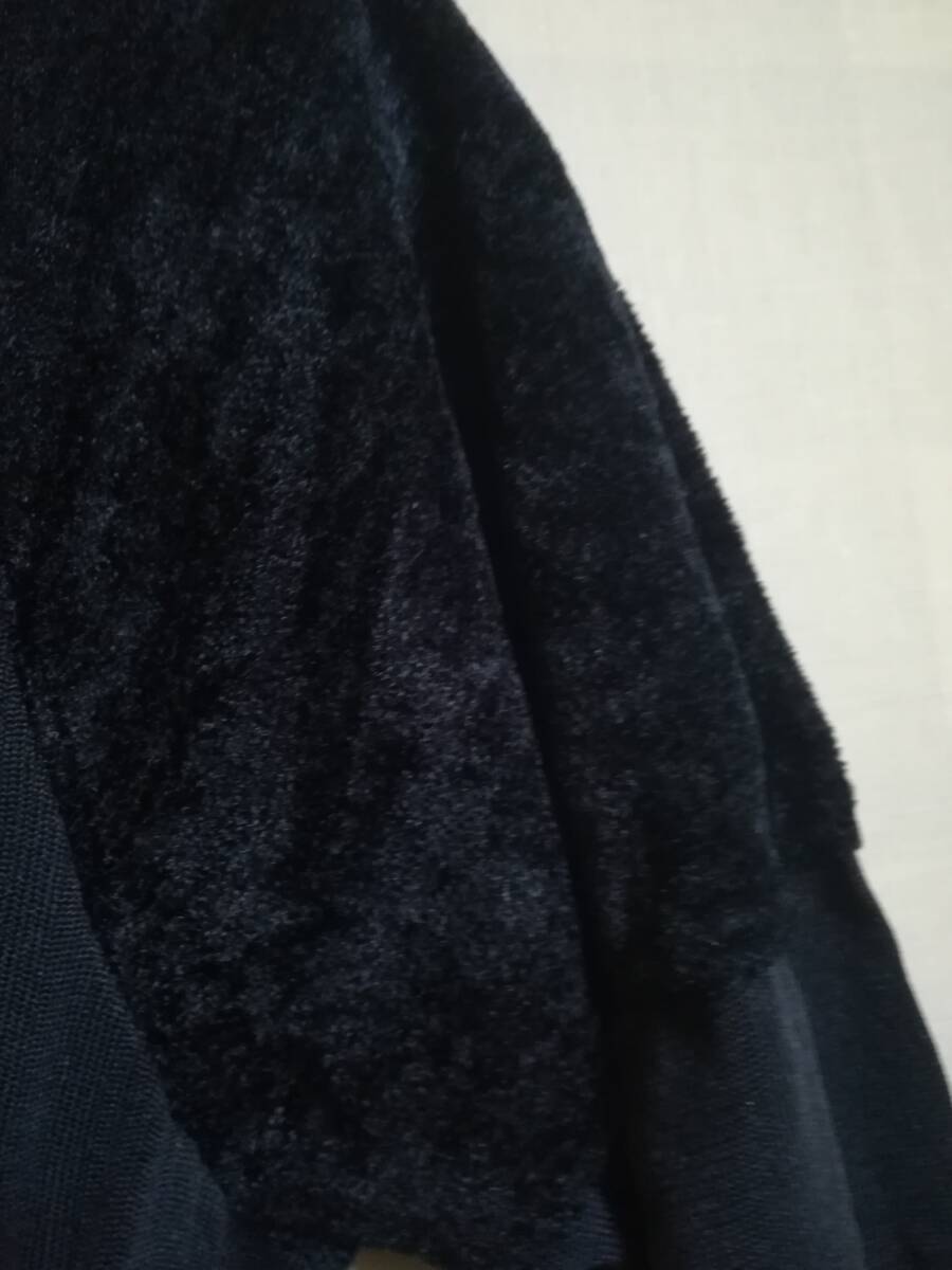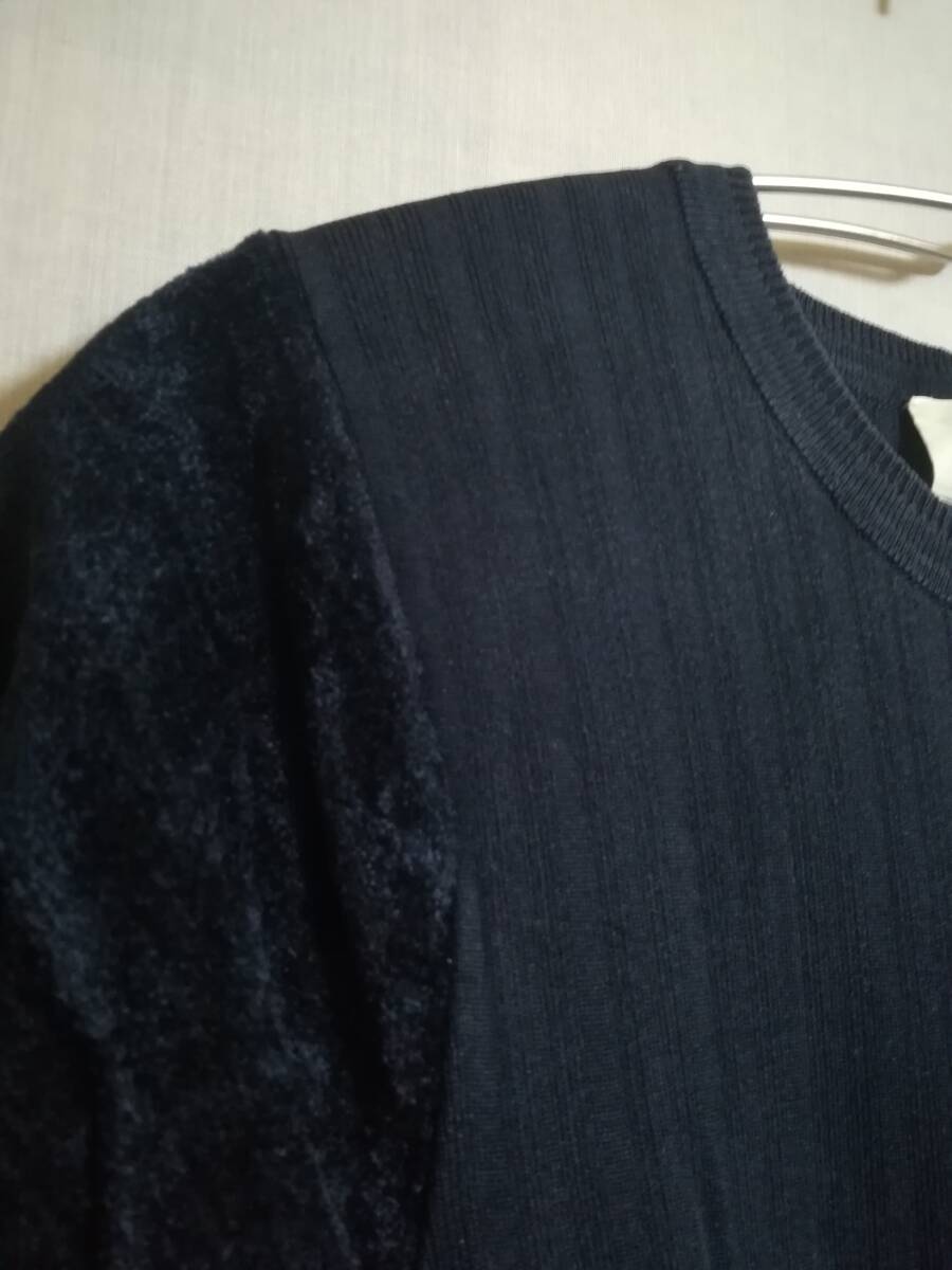 この素材をドレスに適したスムース編みで編みたてています。ボディーは縦に流れる地柄を入れ、袖にはベルベット素材をインターシャで編みこんでいます。