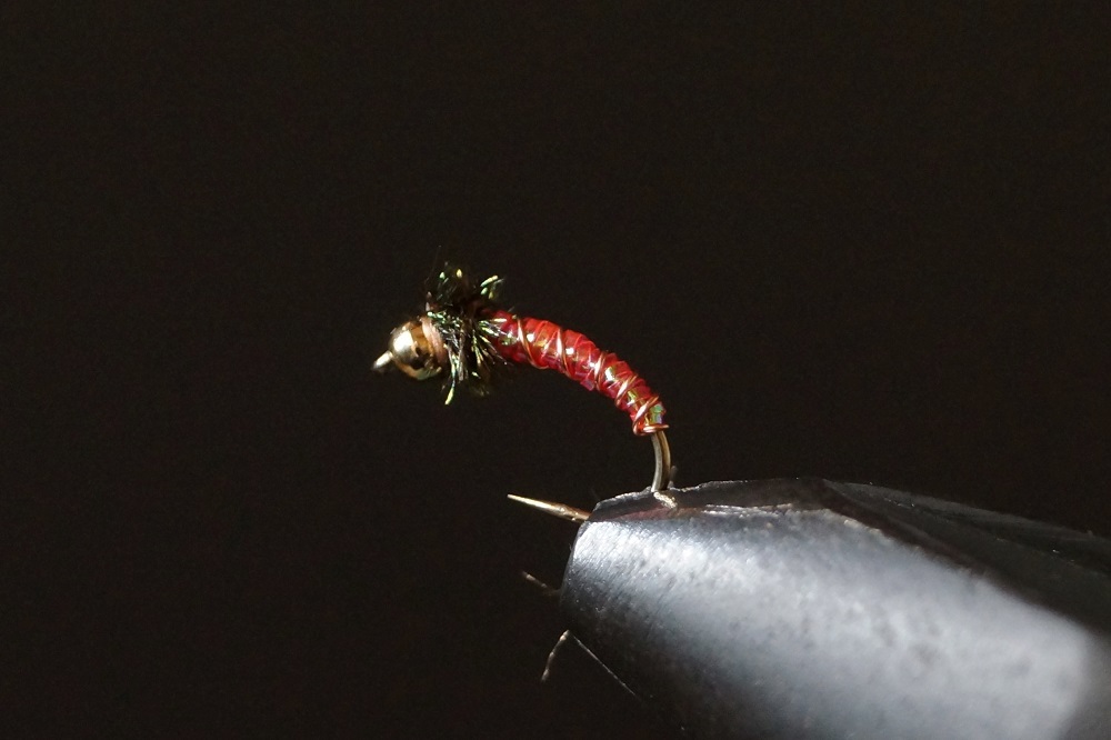 ボディーに紫外線で発光するケイムラ加工を施したの赤系オーロラティンセルを使用したピューパです。#12バーブレスフックを使用した8本セットをご用意致しました。発送は定形外郵便を予定して居りますが、破損・紛失で補償されませんのでご了承ください。