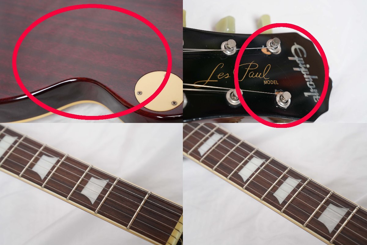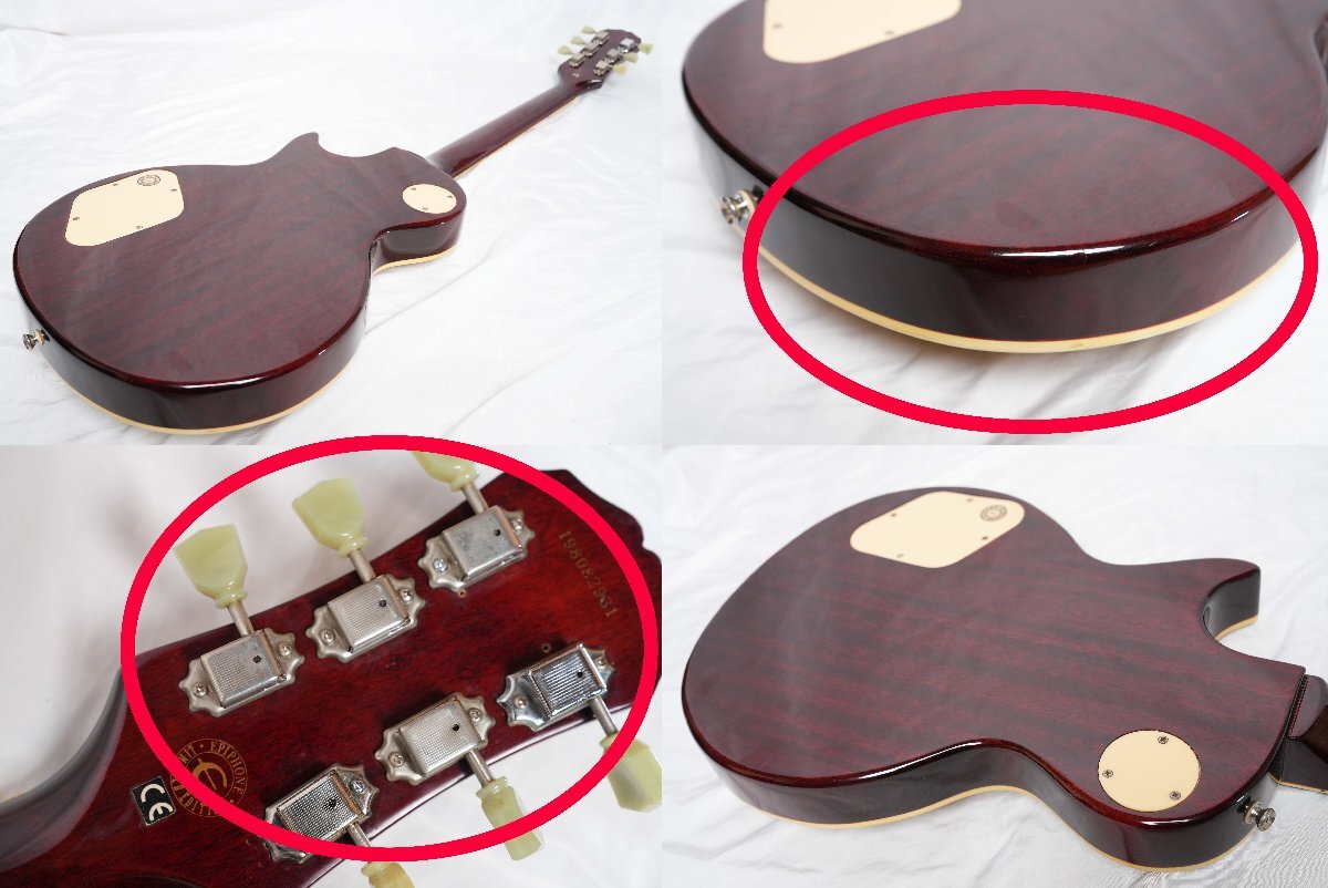 1998年製の’56スタイルのP-90を搭載したゴールドトップ仕様のレスポール Epiphone ’56 Les Paul Standard Gold Topです。オリジナルP-90ピックアップを搭載し、エッジの効いたドライなサウンドで多様なジャンルに使用できると思います。 シャープなサウンドでありながらもレスポールらしい厚み、サスティーンのあるサウンドで多様なジャンルに対応できると思います。初心者から上級者まで幅広いユーザーに対応しています。 マイルドなエアー感のあるサウンドでジャズにも最適です。音も太く、ロック感も感じられる出音です。 ■■■以下わかる範囲でのスペックです。■■■ ボディ材 : Maple Top +Mahogany ネック: Mahogany 指板 : Rosewood ピックアップ : オリジナル P-90ピックアップ 重量 :約3.8kg ナット幅 : 約43mm シリアルナンバー : I98082××× カラー : Gold Top フレットは主観ですが約7~8部山程度残量があります。 ■商品の状態■ *数カ所、目立った傷、擦り傷などありそれなりに使用感が感じられるプレイヤーズコンディションです。 *金属パーツのクスミ、一部腐食があります。 *ペグが社外品に交換されています。 *ピックガード、ケースが欠品しています。 *ネックはほぼフラットで反りは感じられません。 *動作確認済みです。 ■付属品■ なし | ||