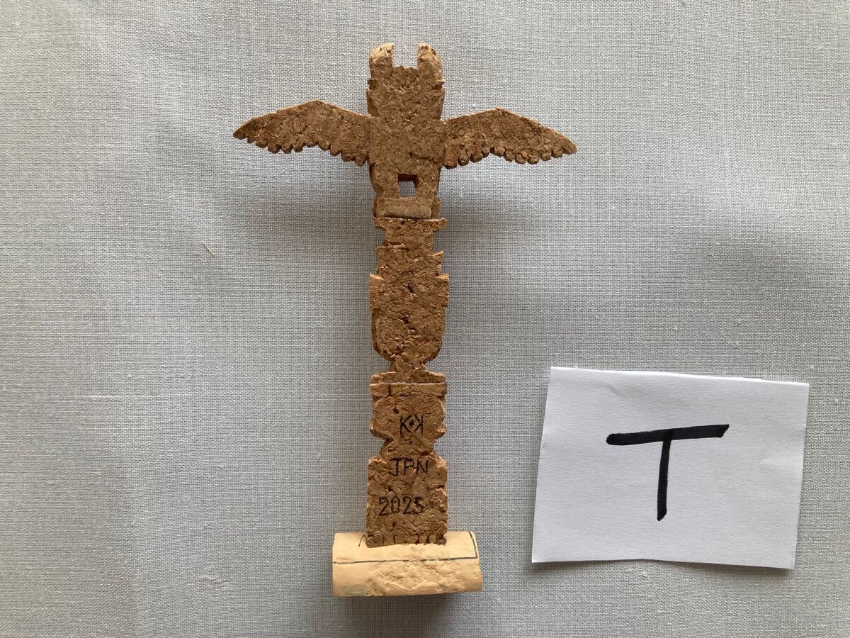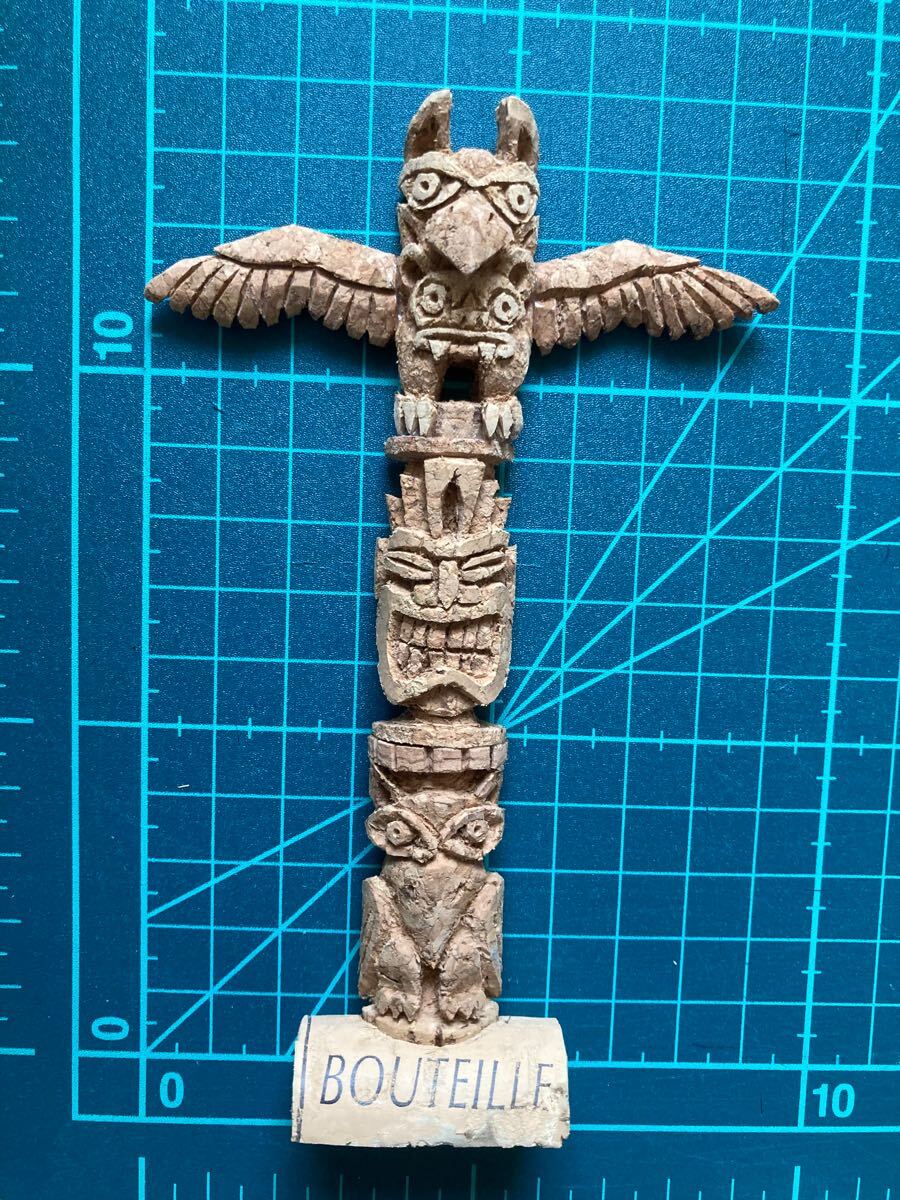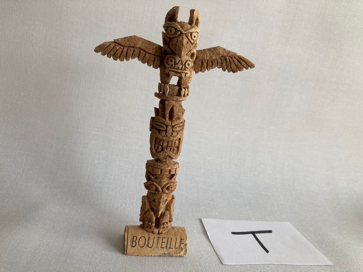 コルク製トーテムポールスタイルの彫刻で、約14cmの高さでインテリアに最適。