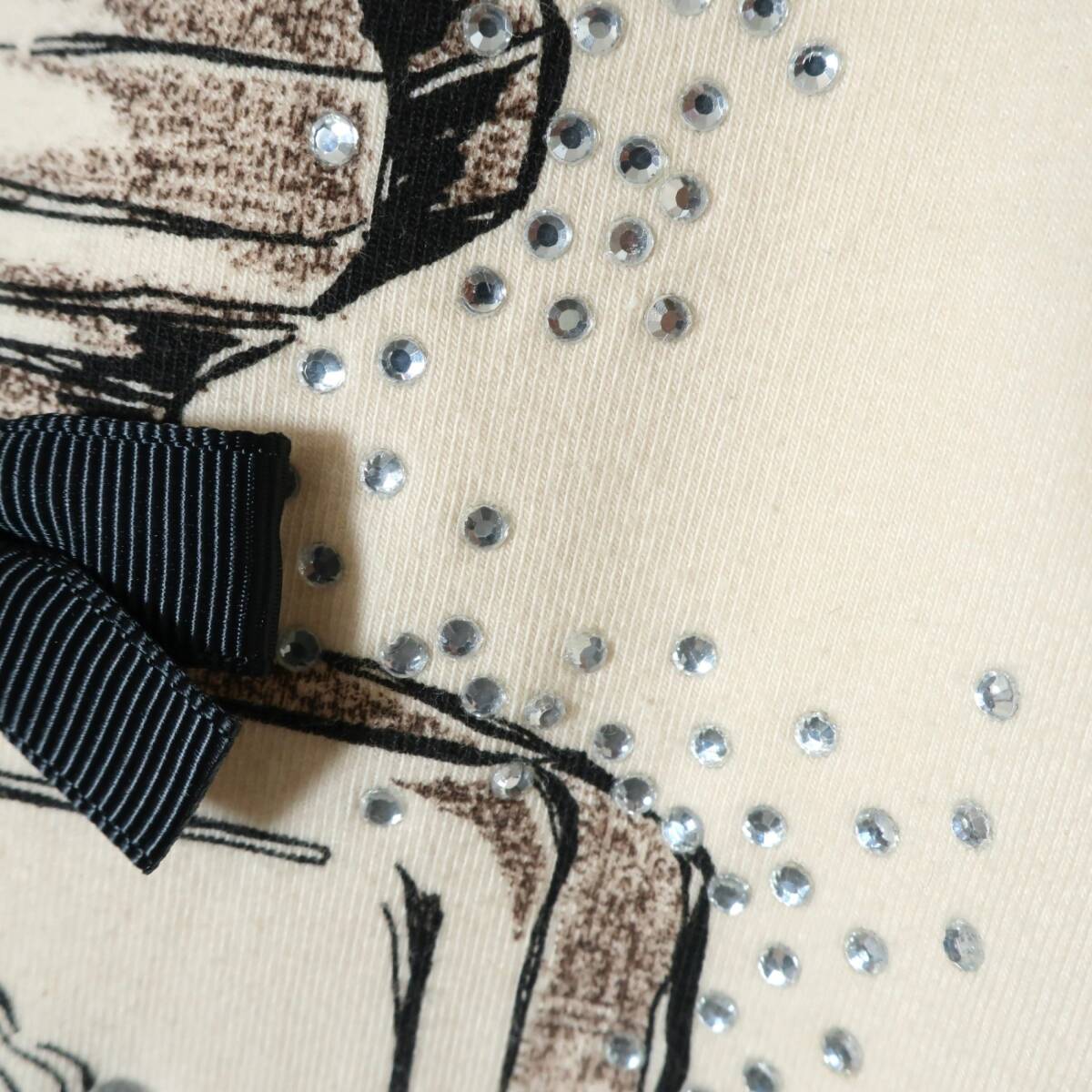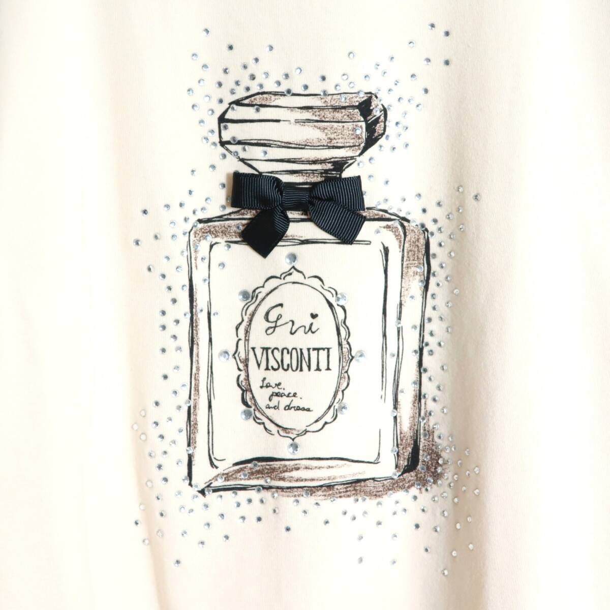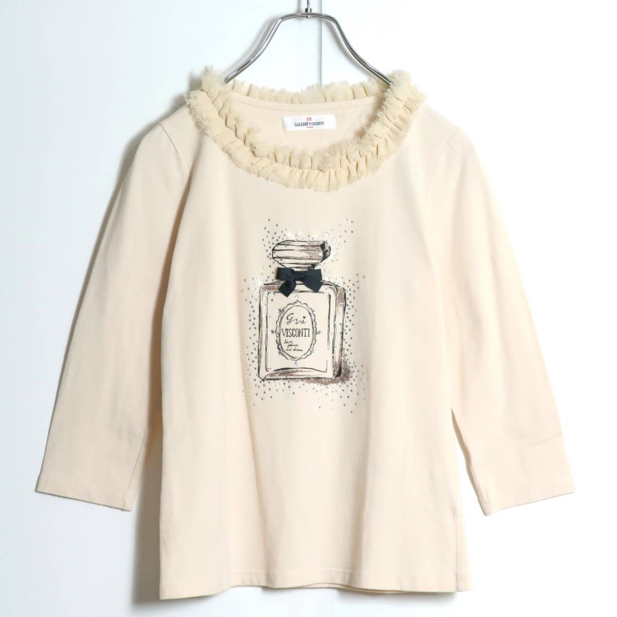 商品説明 | 【実寸約】肩幅34袖丈43バスト84着丈52(cm) 【サイズ表記】 2 【素材】綿95ポリウレタン5 【状態】使用感少なめの美品 【デザイン】ベージュ色系 薄手/ラインストーン・リボン・切りっぱなし加工ネック 香水プリントとラインストーンがかわいい七分袖シャツです。 |