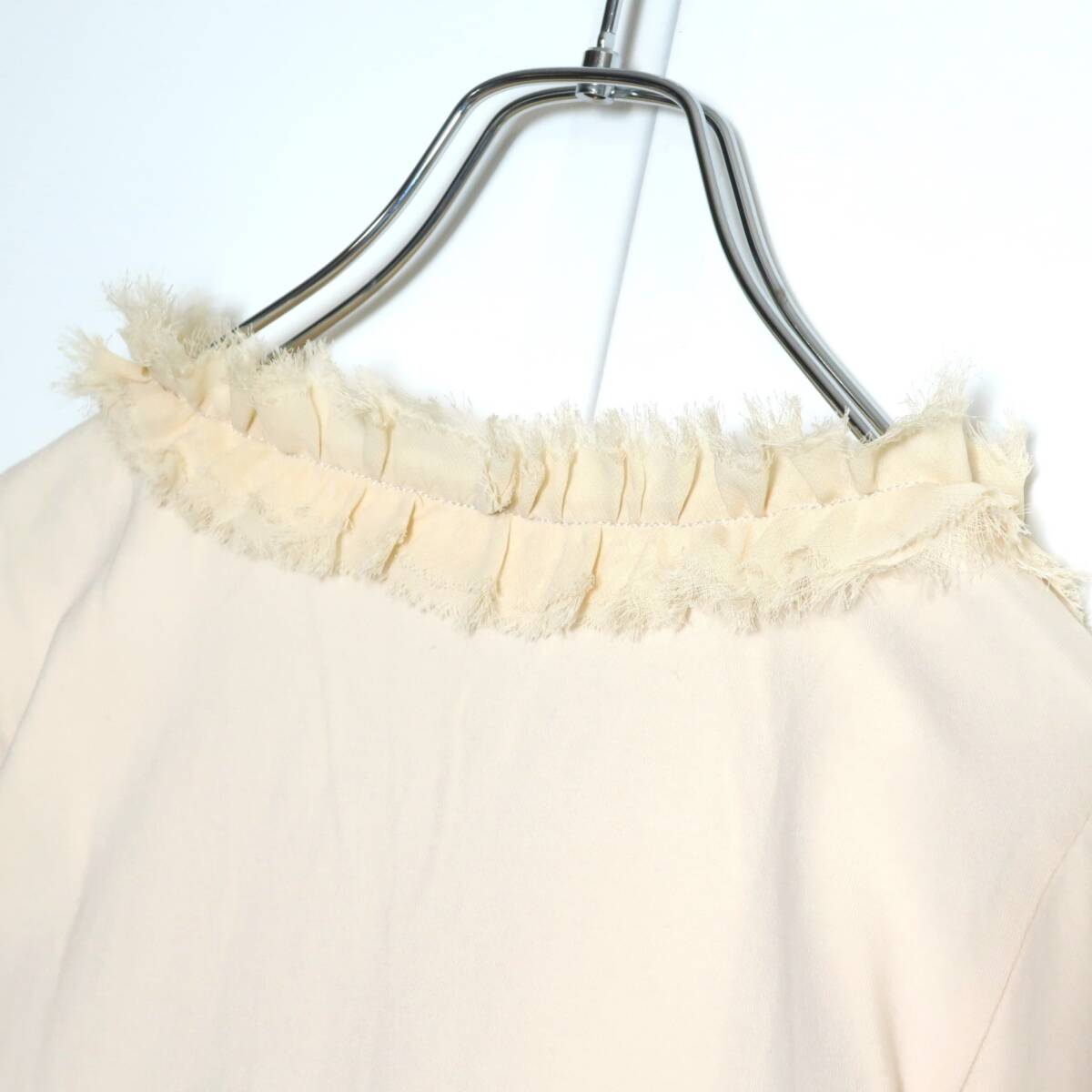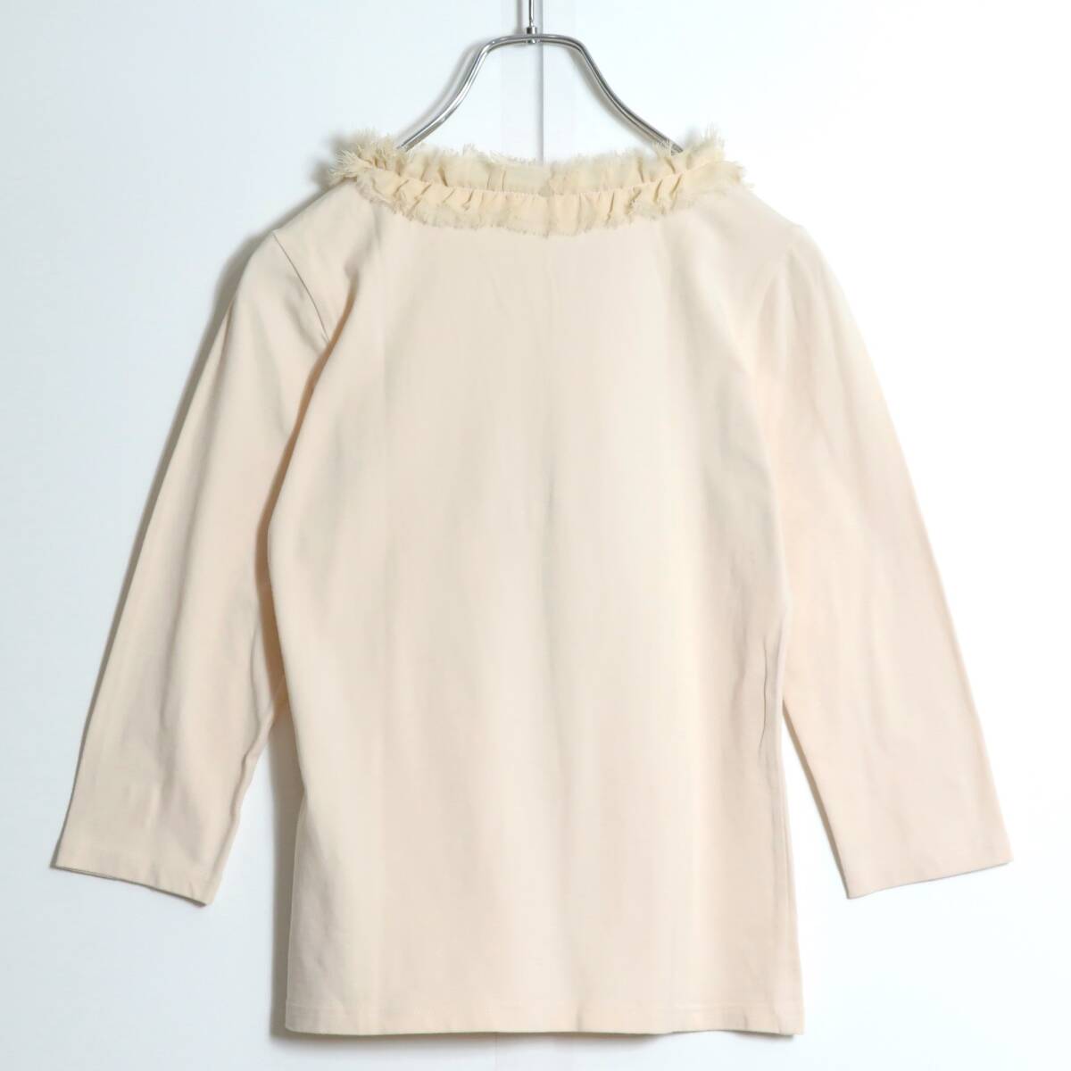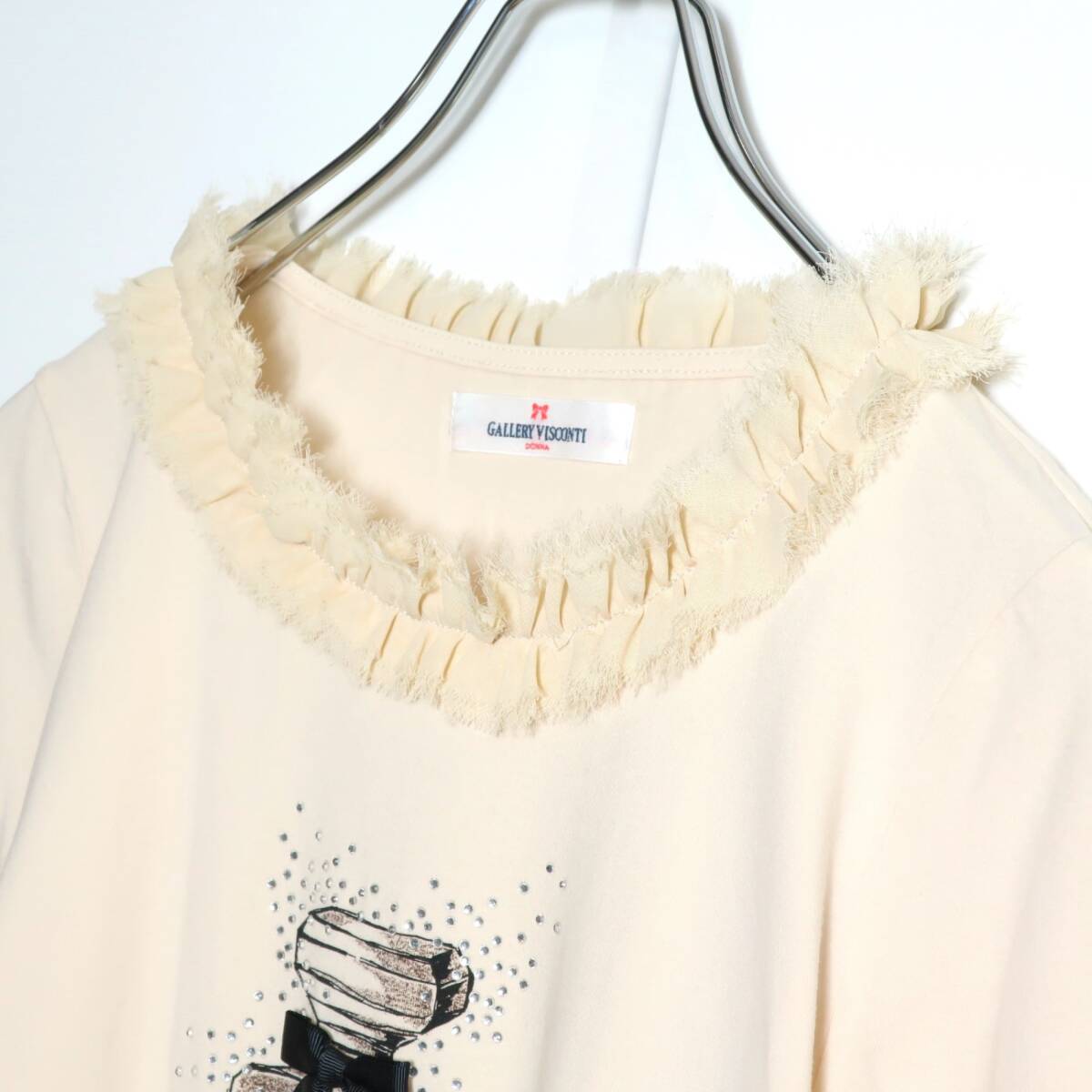 商品説明 | 【実寸約】肩幅34袖丈43バスト84着丈52(cm) 【サイズ表記】 2 【素材】綿95ポリウレタン5 【状態】使用感少なめの美品 【デザイン】ベージュ色系 薄手/ラインストーン・リボン・切りっぱなし加工ネック 香水プリントとラインストーンがかわいい七分袖シャツです。 |