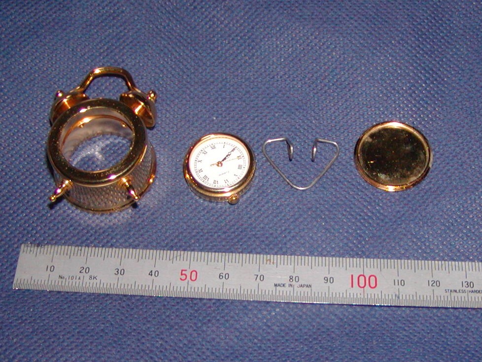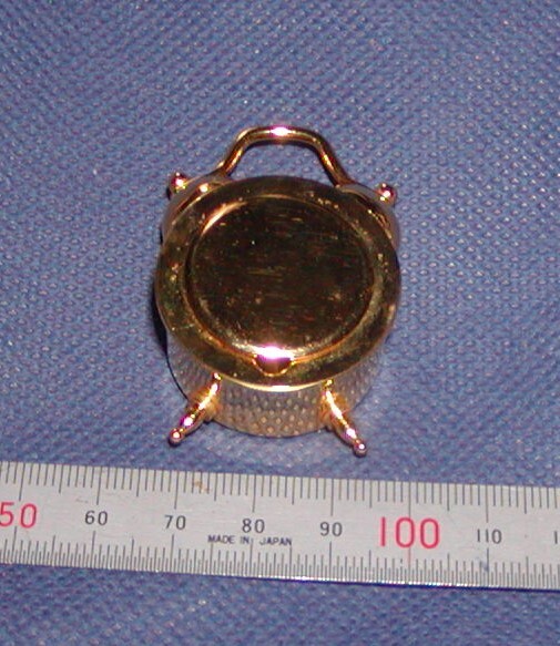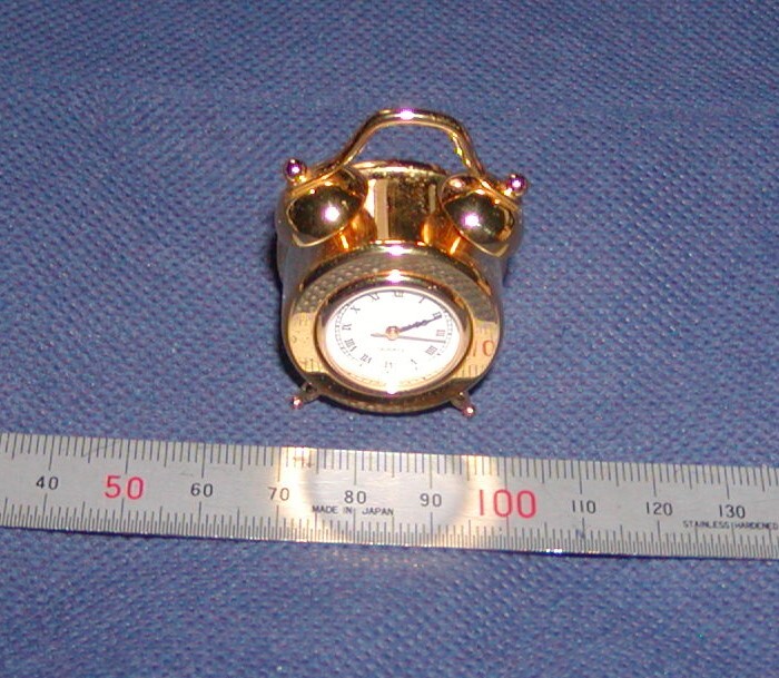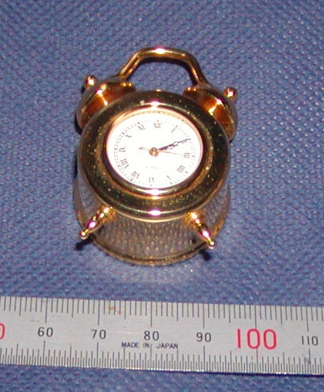 小さい金属製のクオーツ式置時計になります。ただいま電池切れにて不動です。宅急便の場合は60サイズ送料着払いになります。