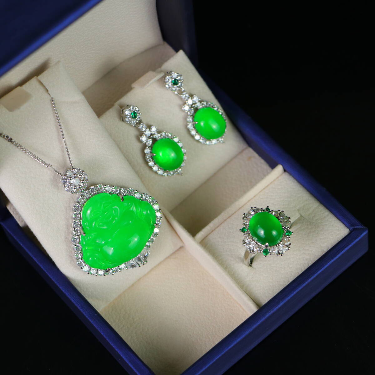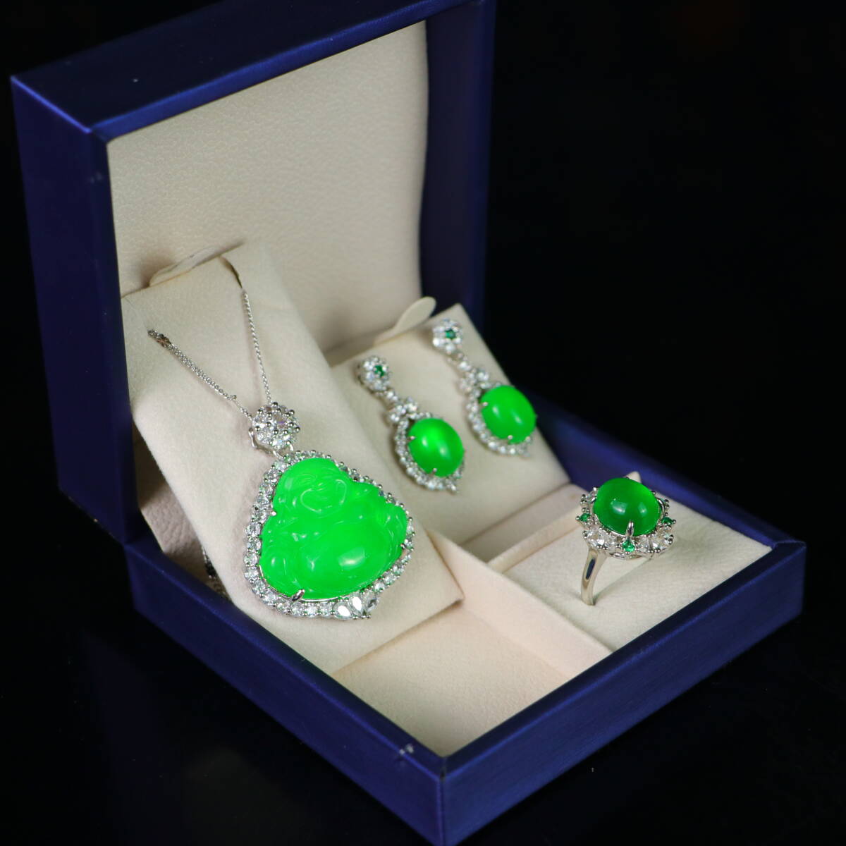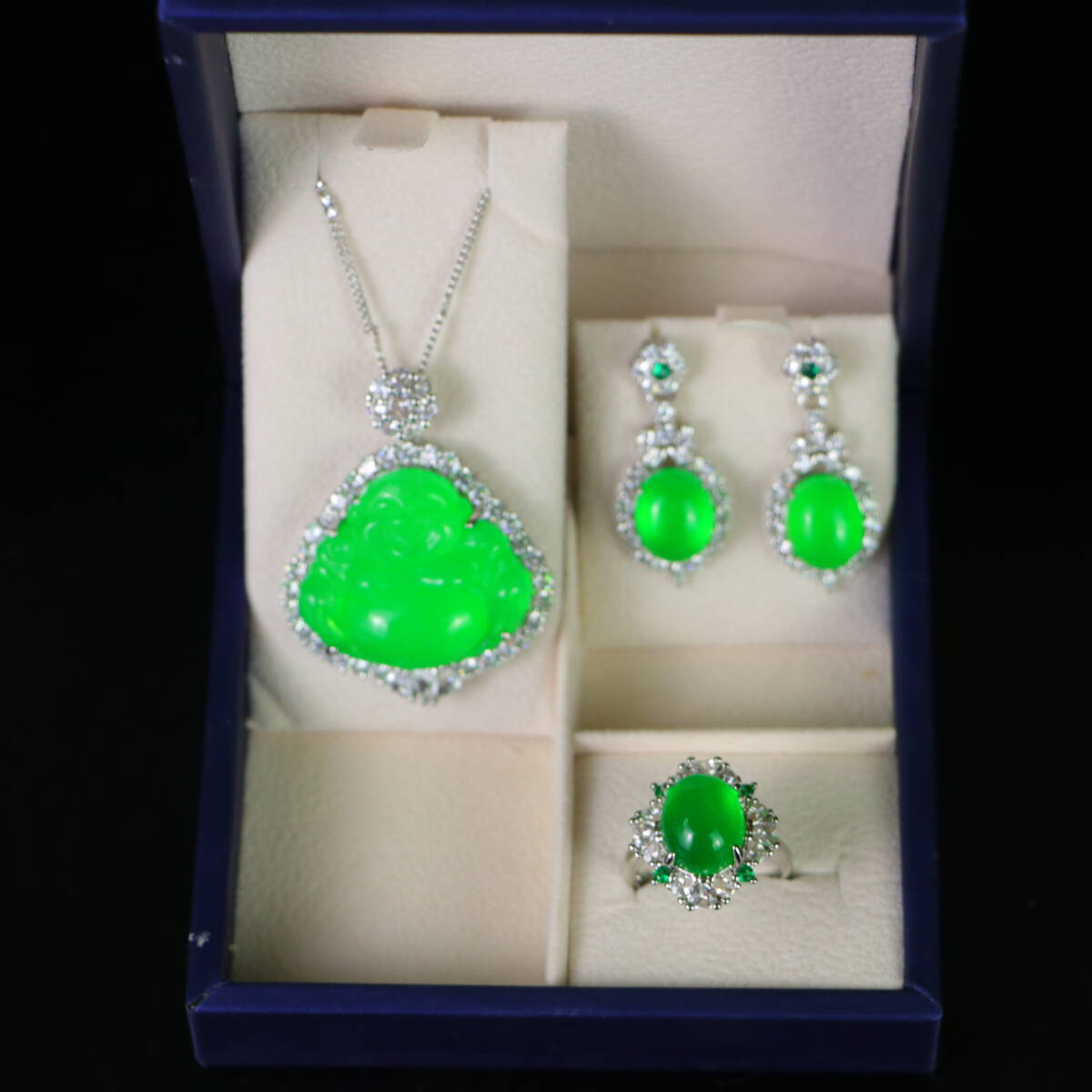 清 宮廷御製 古高冰寶石嵌 寶石 項鏈 戒指 耳釘 三件套 箱付 極細工 東洋彫刻 中国唐物 骨董品 古賞物 中国古玩 中国古美術