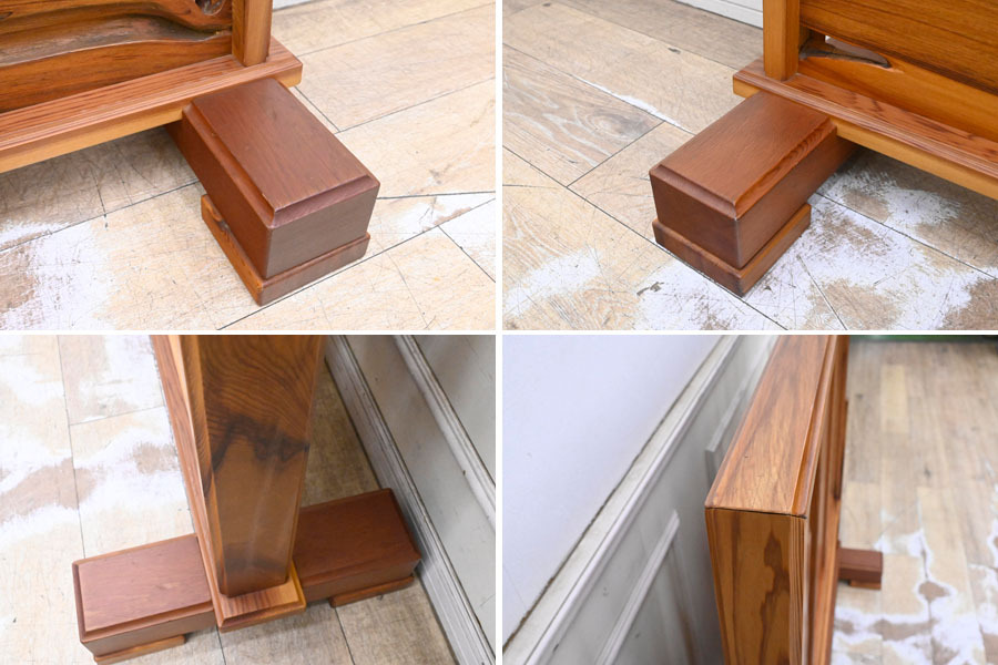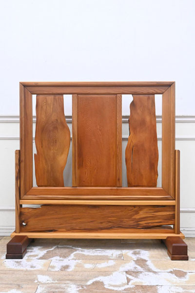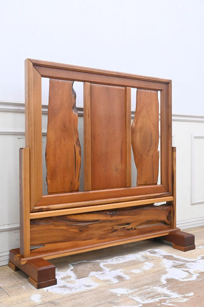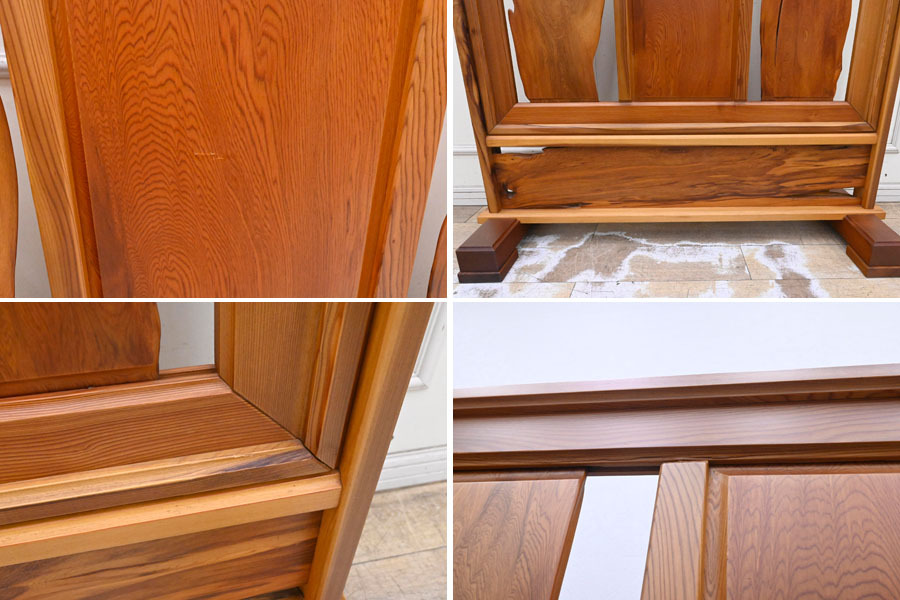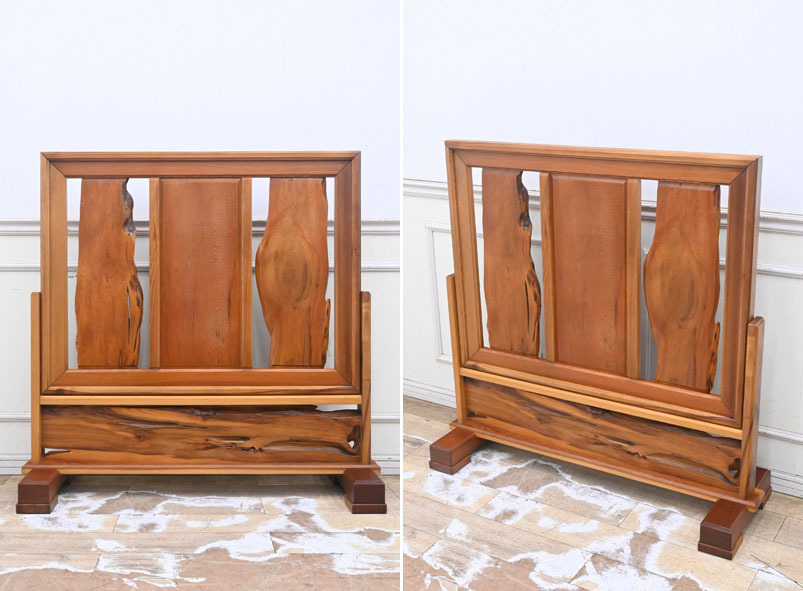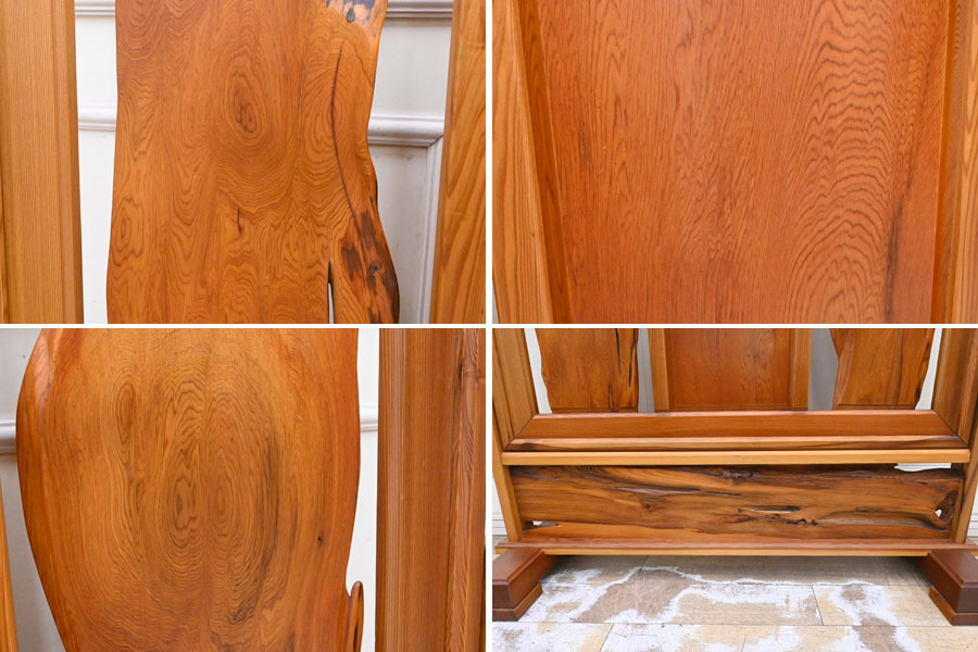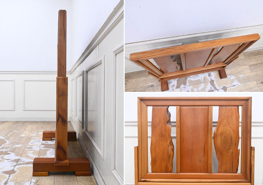 ----------------------------------------------------------------------------------------- ●送料や注意事項は必ずご確認下さい。落札後にトラブルになるケースが増えております。● ◆コンディションは写真・文章にて記載して有りますが、全てのキズの写真は掲載致しておりません。大きなダメージを除き見落とし、記載漏れが有る事はご了承下さい。 ◆当サイトにて出品する商品は多種多彩で、当方商品知識の無い物も多数ありますので落札後の質問やメンテナンス等にはお答えできません。 ◆入札された時点で、画像、文章をご理解していただいたものと判断させていただきます。不明な点は前もってQ&Aからお願い致します。入札後の質問やお電話等でのキャンセルは一切受け付け致しません。 ◆商品説明に「ノークレーム」と記載しているものに関しては、如何なる状況で届いても保証致しません。詳しくは注意事項の「商品到着後について」の最後に記載しておりますのでご確認下さい。 ---------------------------------------------------------------------------------------- 世界遺産認定により、伐採禁止となり、更に希少価値が上がった屋久杉の衝立、中古品の出品です。 一般に樹齢が300年ほどと言われている杉が、2000年、3000年もの長寿の杉になるのは、年間4,000mmから10,000mmもの多雨に恵まれている屋久島の特殊な自然環境と、屋久杉の樹脂の特性が起因しています。 屋久島の土台は花崗岩で栄養分が少なく、杉の生長が他の地域に比べ遅くなります。 すると、年輪の幅が緻密になり材は硬くなります。 そうなることで樹脂道に普通の杉の約6倍ともいわれる樹脂がたまります。 この樹脂は防腐・抗菌・防虫効果があり、しかも硬質な材のため、屋久杉は長い年月の間不朽せずに生き続けられる素晴らしい特質性があります。 幅120 奥41 高116cm 【コンディション】 中古品ですのでキズ、ヨゴレ、真中板にキズ、上部フレーム見えにくい所に割れヵ所、脚にダコン、横のフレームキズ等有りますが状態は良好です。 | ||