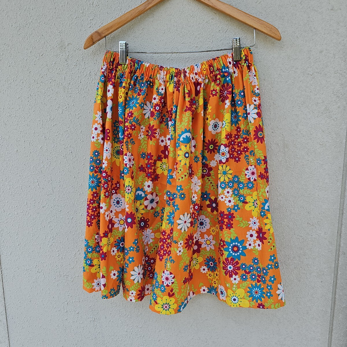 出来上がりサイズは平置きで、ウエスト(総ゴム)35cm、ヒップ108cm、裾幅54cm、総丈(ゴム部含めて)57cm、股上37cmです。