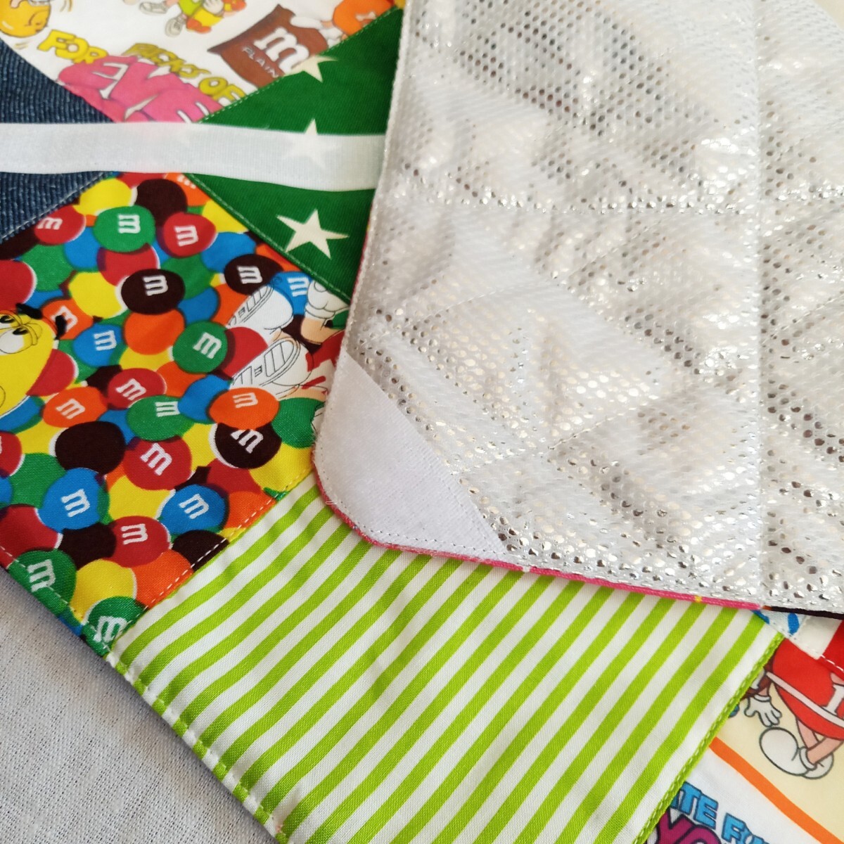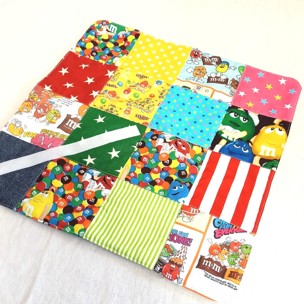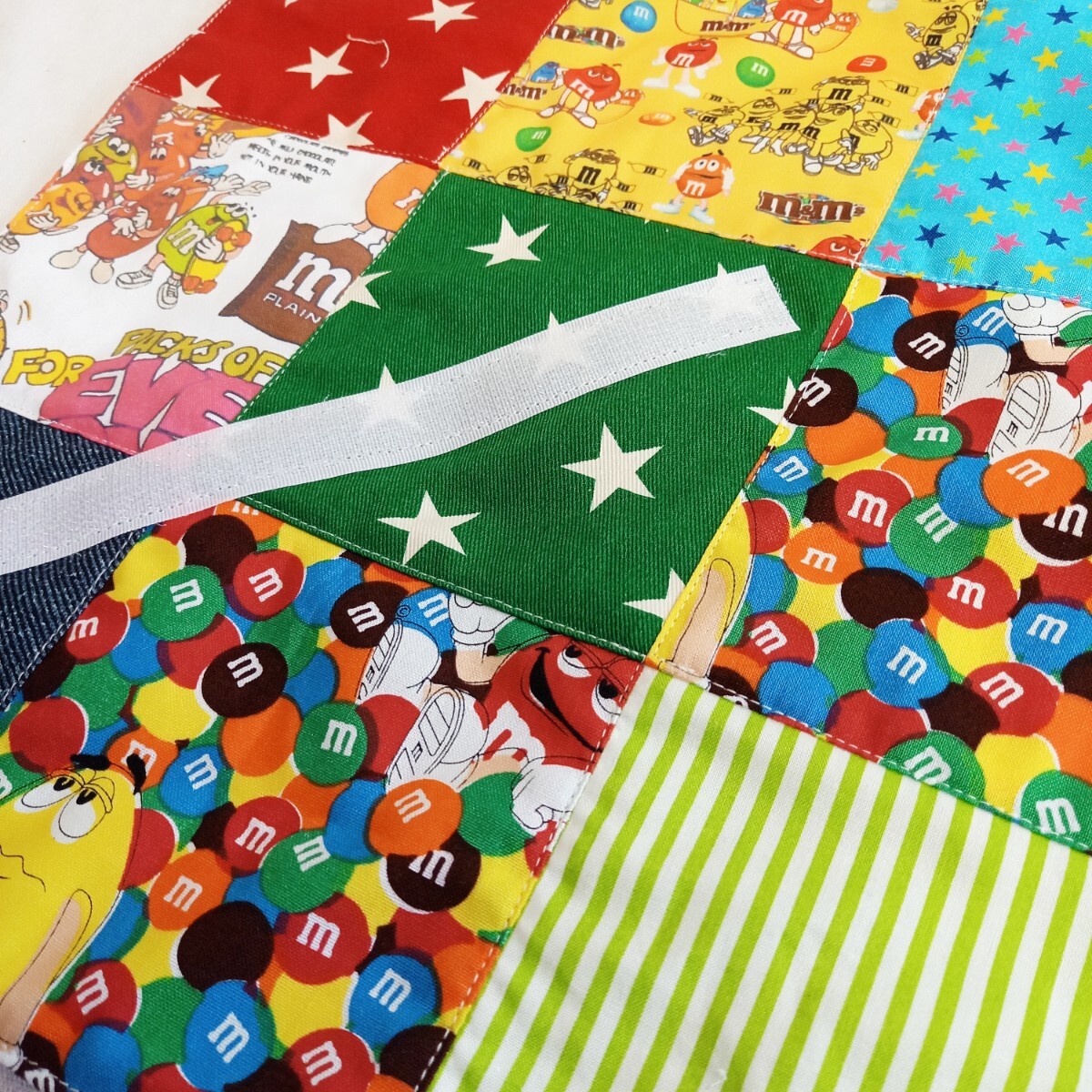 表側はm&m'sと様々なカラフル生地をパッチワークしたデザインです。