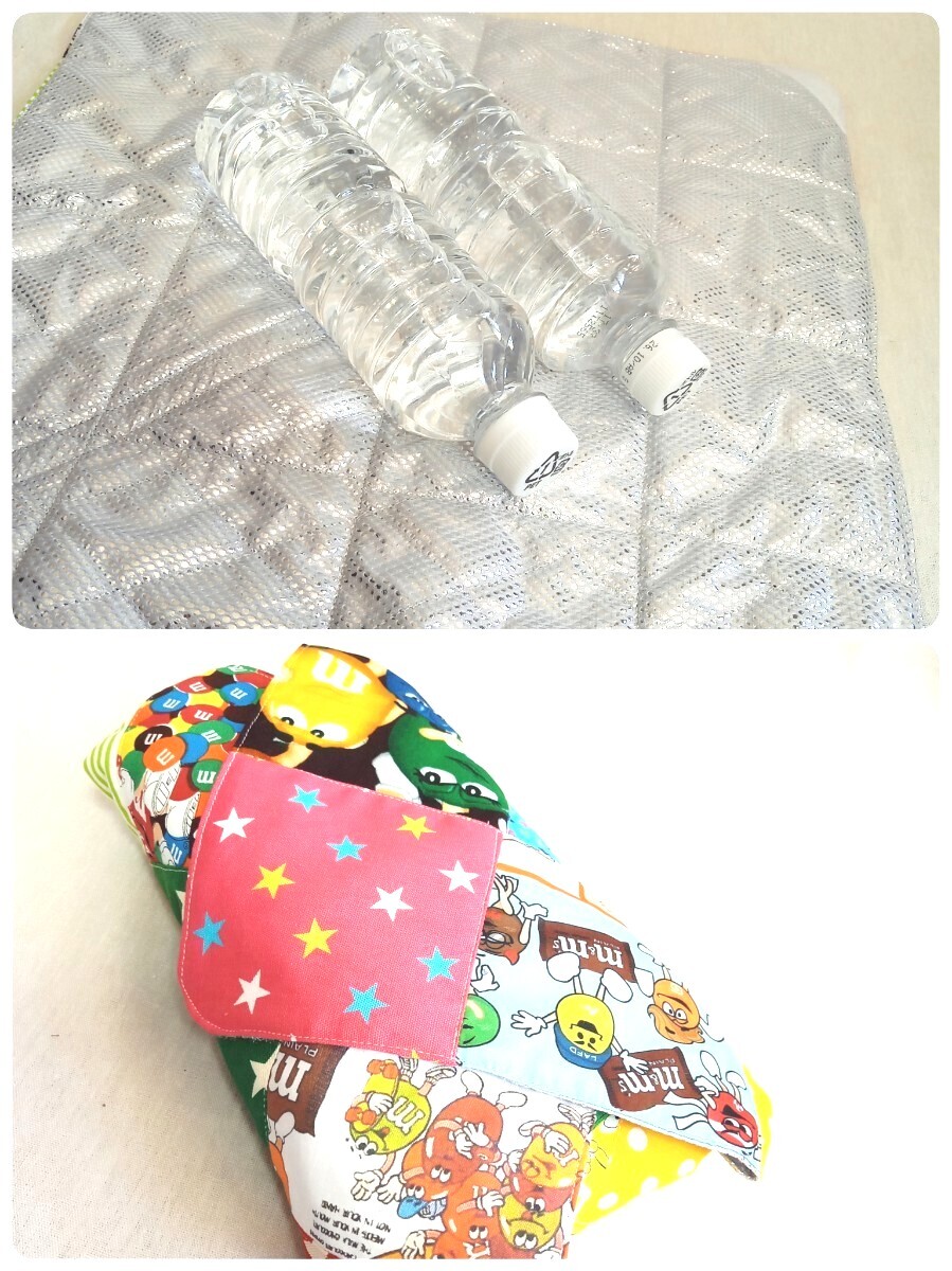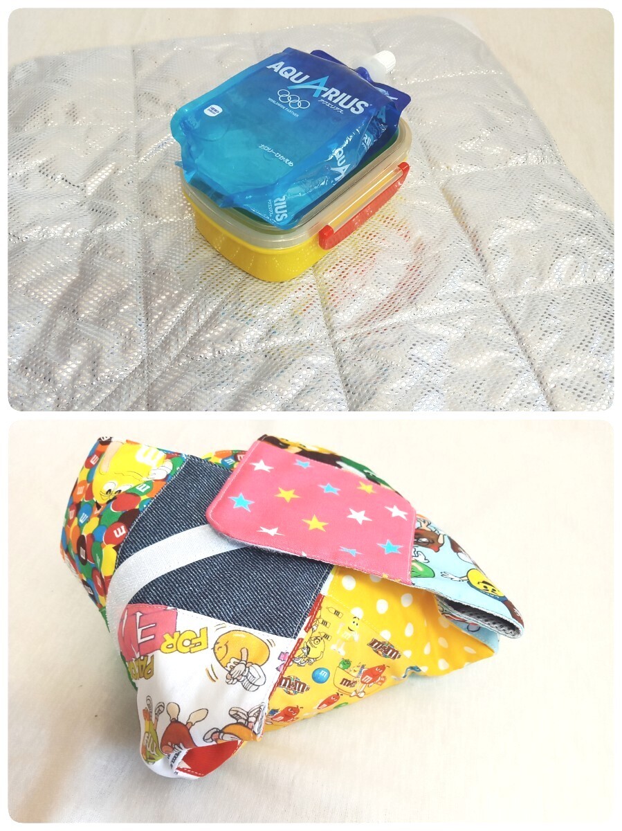 裏面はお洗濯可能(乾燥機は不可)なアルミシートを使用していますので、画像のようにお弁当やペットボトルを包め、そのままランチクロスとしてご使用頂けます♪