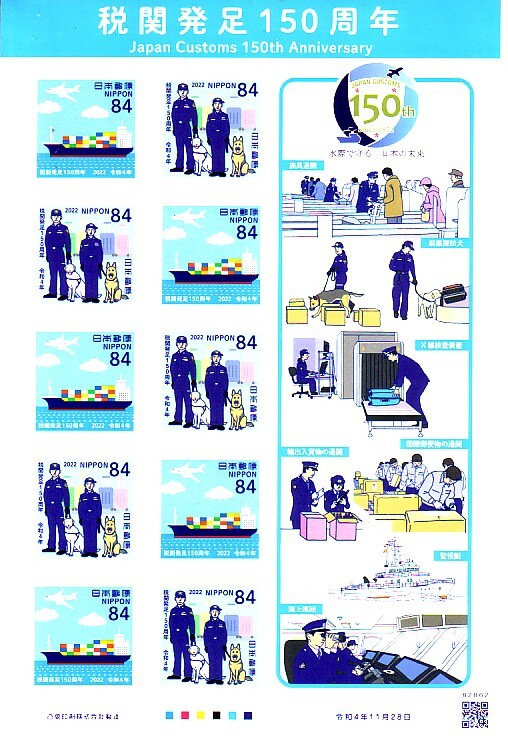 「税関発足150周年」の記念切手です (84円切手X10枚)。送料は普通140円(普通便 複数同梱発送では180円)になります。
