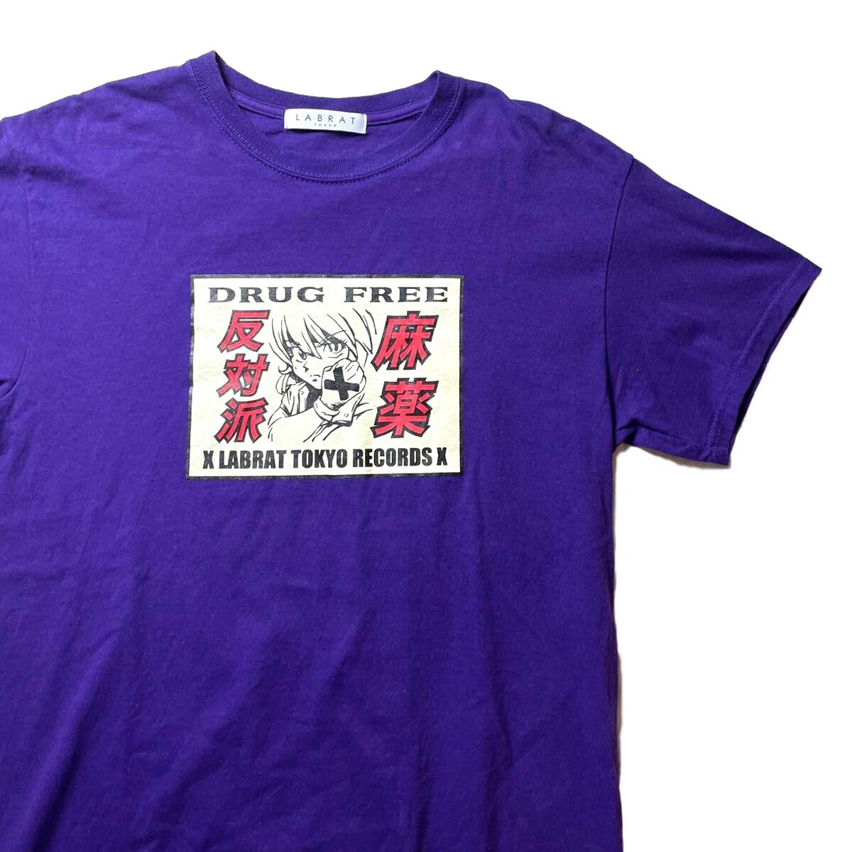 3000円スタート! LABRAT TOKYO ラブラットトーキョー RECORDS DRUG FREE 麻薬反対派 アニメ キャラ プリント Tシャツ パープル 紫 M メンズ