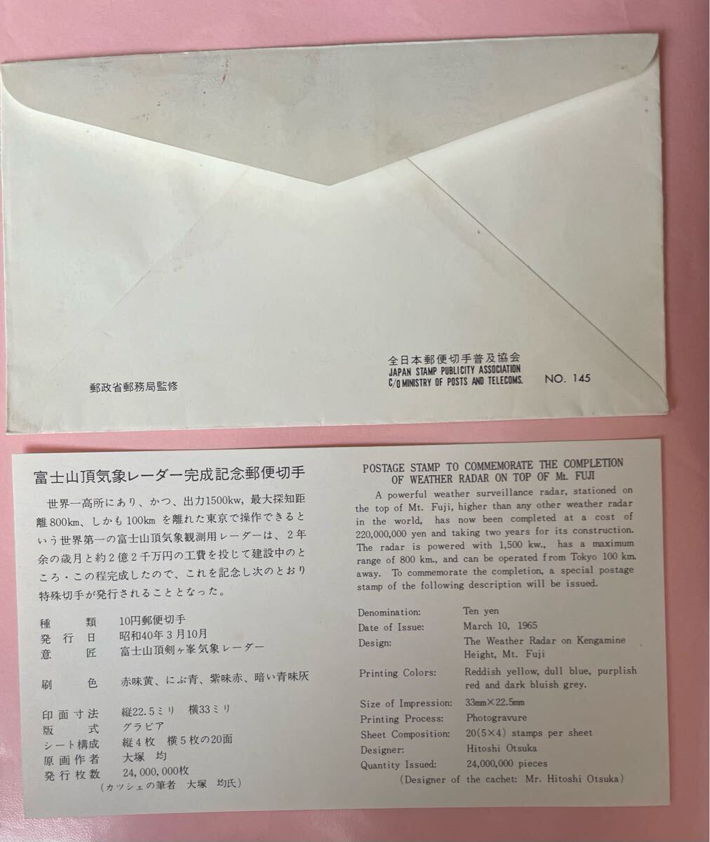 富士山頂気象レーダー完成記念 初日カバーFIRST DAY OF ISSUE: MARCH 10, 1965昭和40年