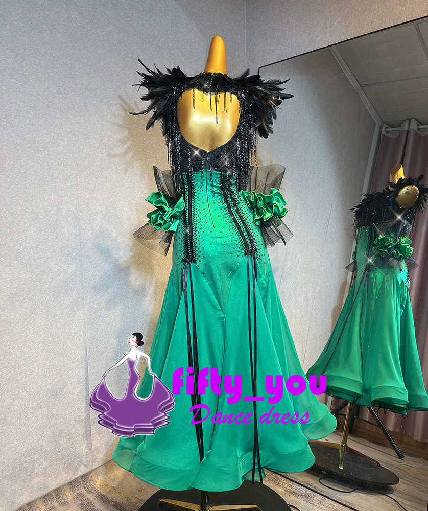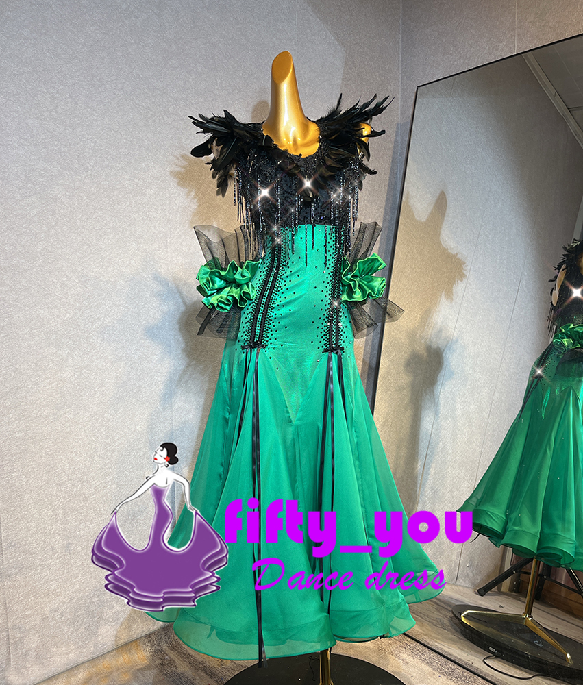 新品fifty_you レディース社交ダンスドレス モダン競技エレガントデザイン サイズオーダー 輝きストーン飾り 羽飾り グリーン