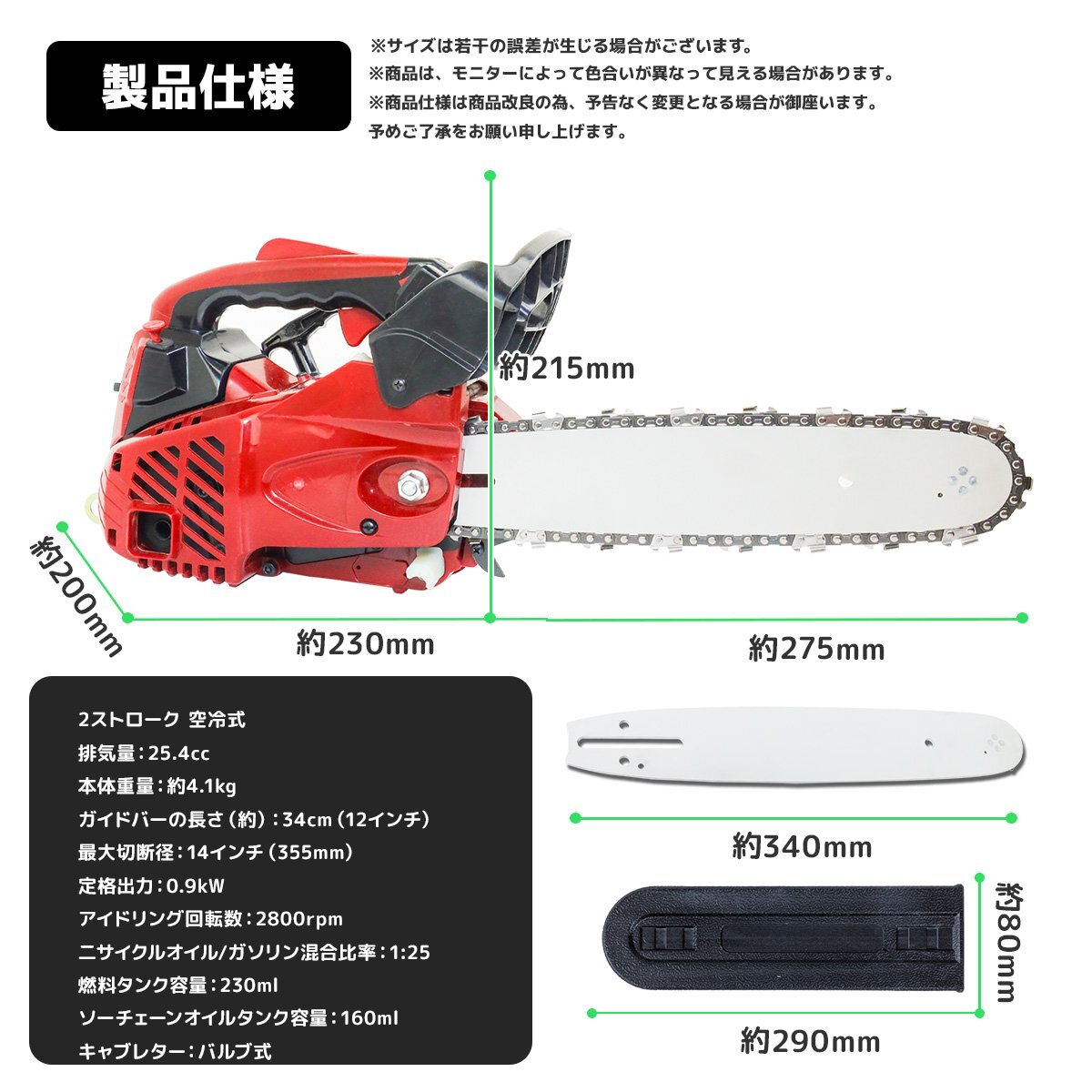 【送料無料】エンジンチェーンソー チェーンソー 排気量25.4cc 空冷式 2ストローク ★ガイドバー長さ34cm 高性能エンジン 伐採 枝木剪定