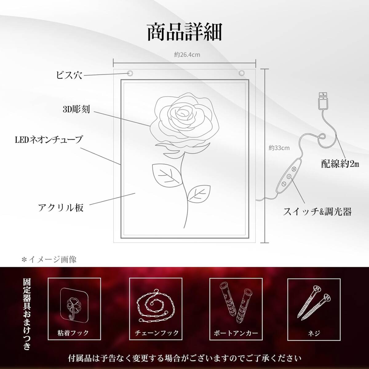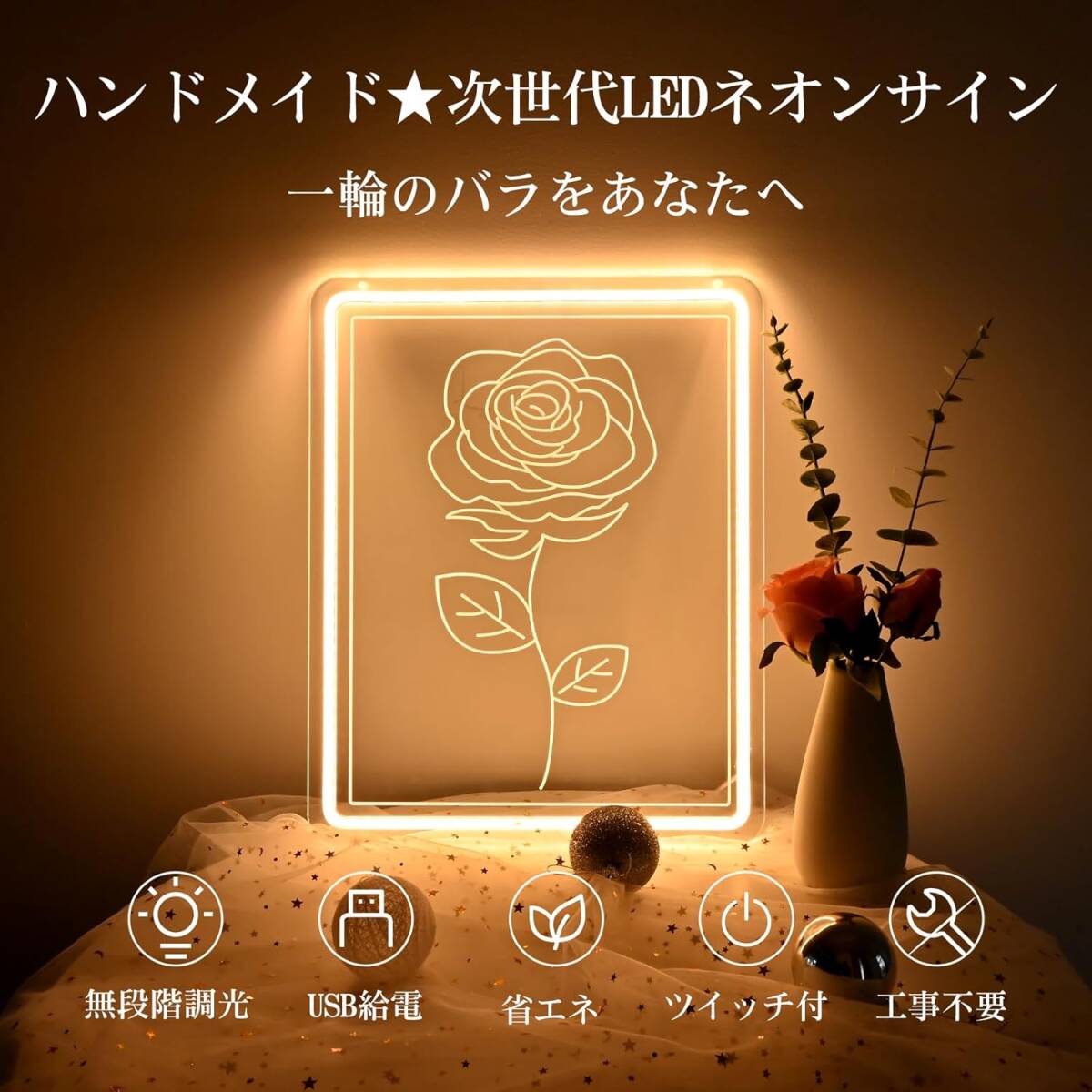 一輪のバラネオンサイン【標準サイズ】」ROSE バラの花 3D彫刻 LEDライト 光る看板 無段階調光 ウォームホワイト 約33×26.4㎝