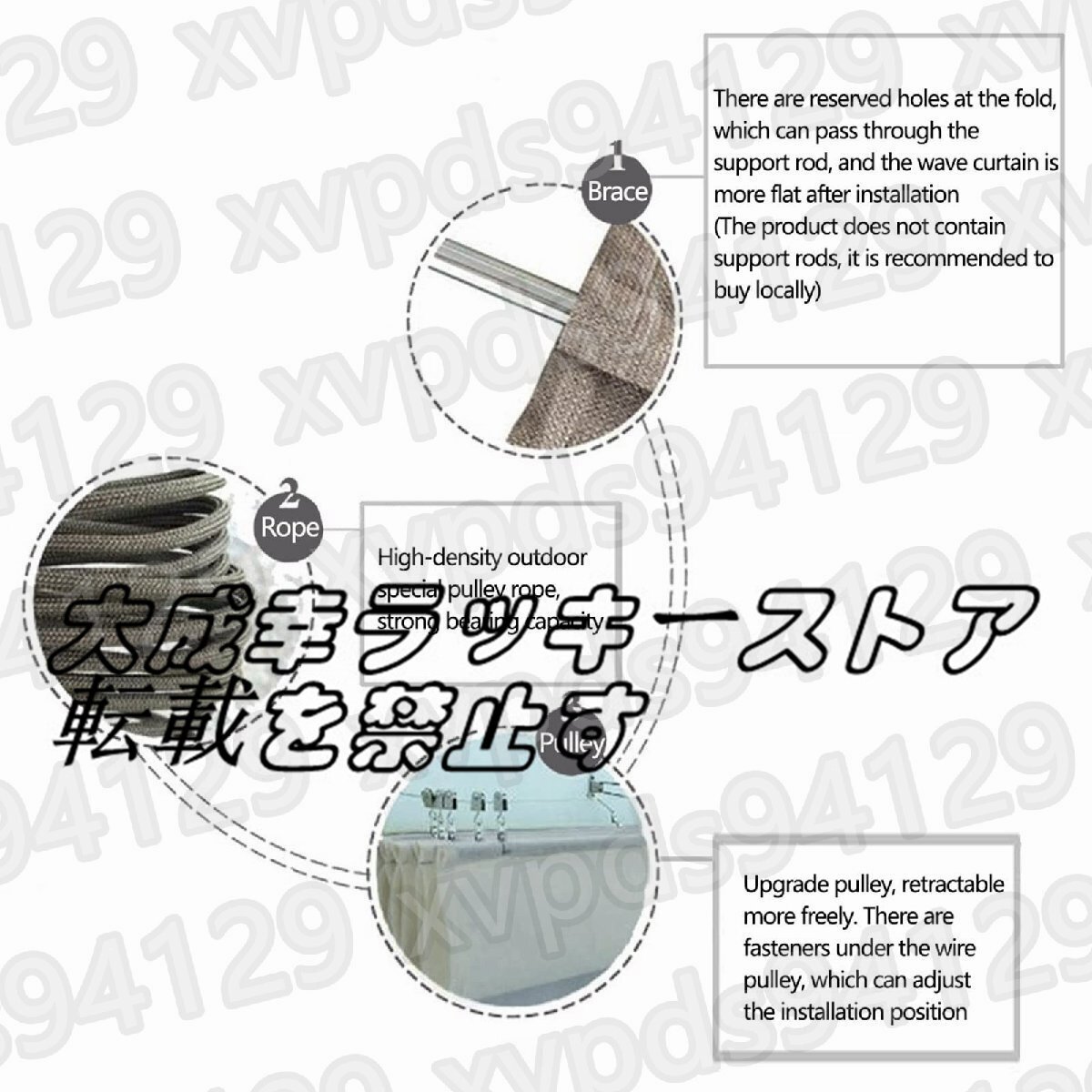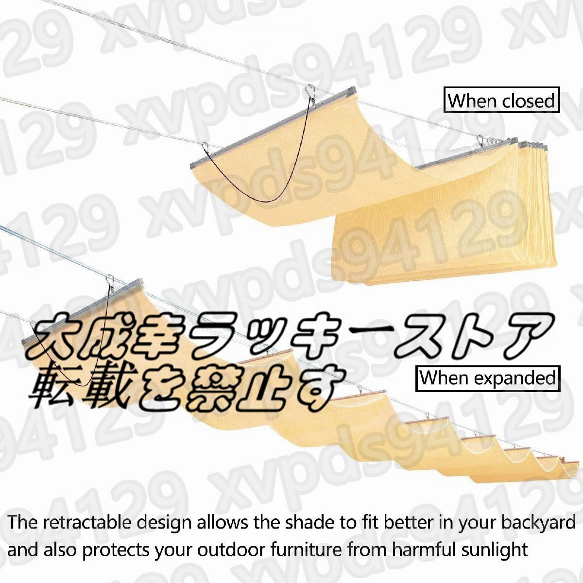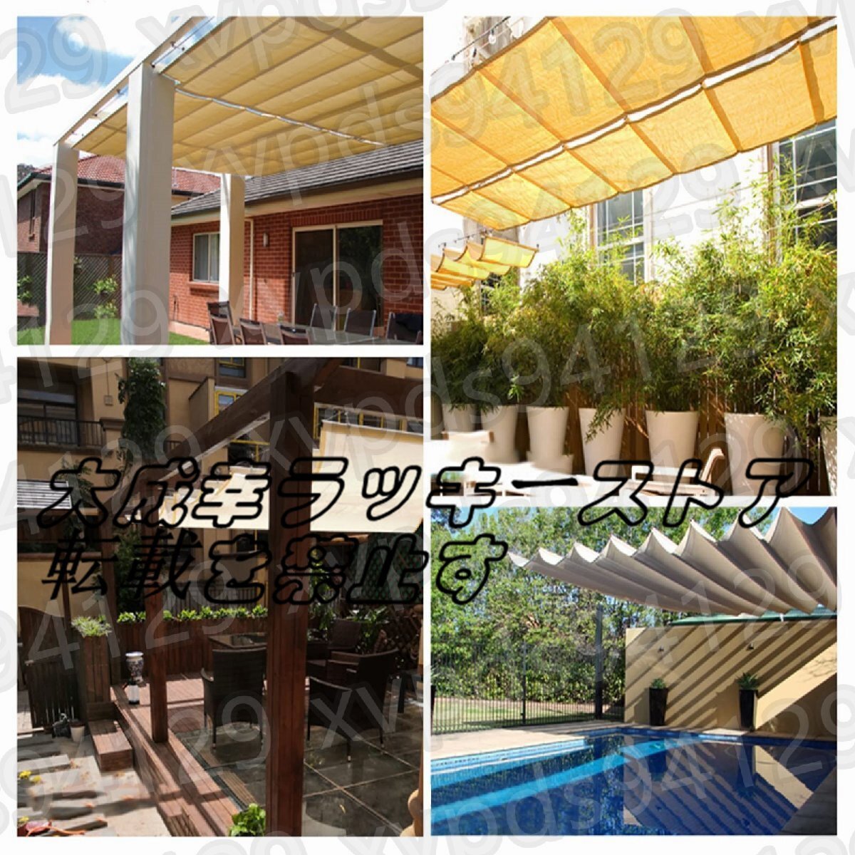 - 高密度ポリエステル素材は、紫外線を見事にブロックし、あなたのエリアを保護し、遮断を提供するのに役立ちます。- パーゴラシェードカバーは、強風や大雨が来たときに、それを下ろすことができる超便利なもので、そのサイズと形状はあなた次第です。プロダクト変数:モデル PF-230406製品名 開閉式シェードカバーキット/屋外遮光装置ニュアンスです: 1カラー:ベージュ素材です: HDPE(ポリエチレン)重量:2000g遮光率です: 90%外部アカウント防水指数:1000mm以下サイズ 長さ×幅(サイズはご要望に応じてカスタマイズ可能です。)計測単位です: M (1M=39.9inch(インチ))。(ヘミングのため、すべての寸法公差は±5%です。)PRODUCT LIST:1x開閉式オーニング304 フラワーバスケット用ネジドアバックルスチールワイヤーロープ(サイズに関係する)サイドプーリー固定プーリーステンレス製パイプクランプスチールワイヤープーリー