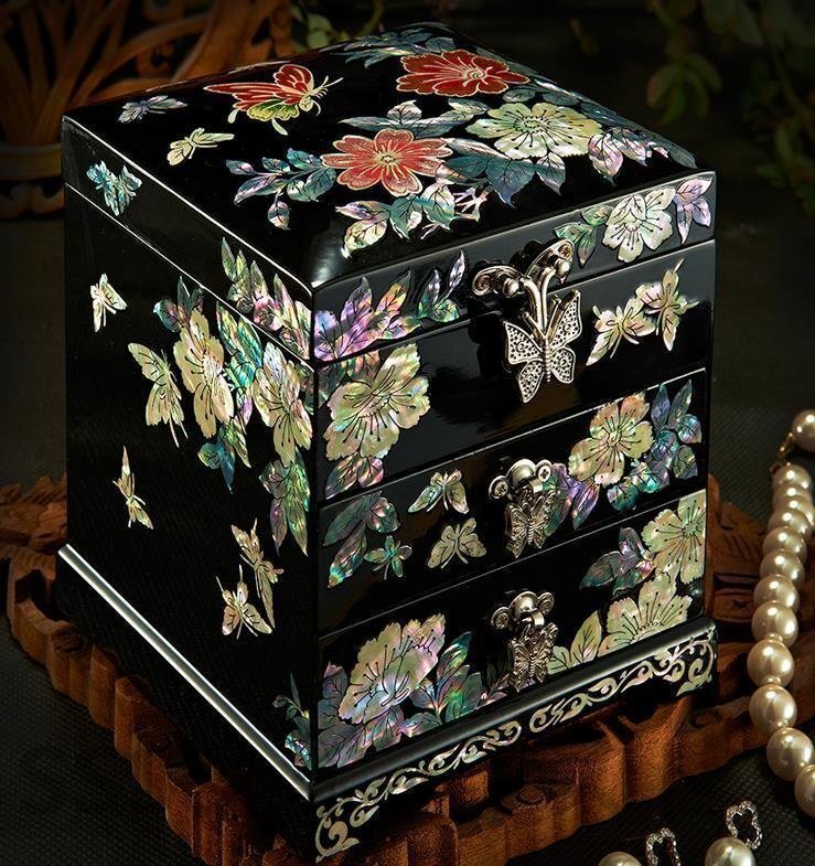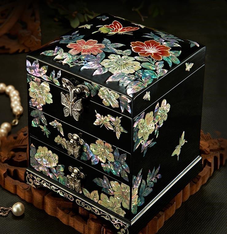 新入荷★純手作り製作 高級感★漆器 天然シェル 木製  真珠層ラッカー貝殻ジュエリーボックス宝石箱結婚アクセサリーケース箱多層