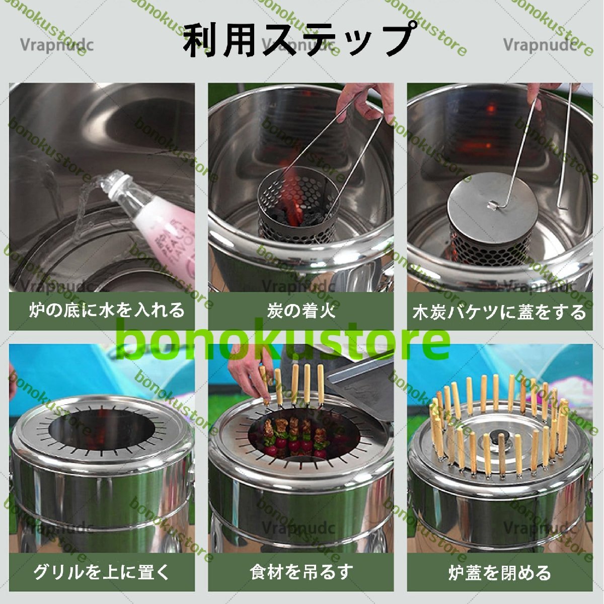 【高品質素材】ハンギンググリル 高温腐食に強く長寿命なステンレス製で、頻繁に木炭を投入する必要がなく、環境に優しく省エネです。熱を反射し360°調理が可能な円形の炉壁を備えているため、カリッとした柔らかな味わいが楽しめます。