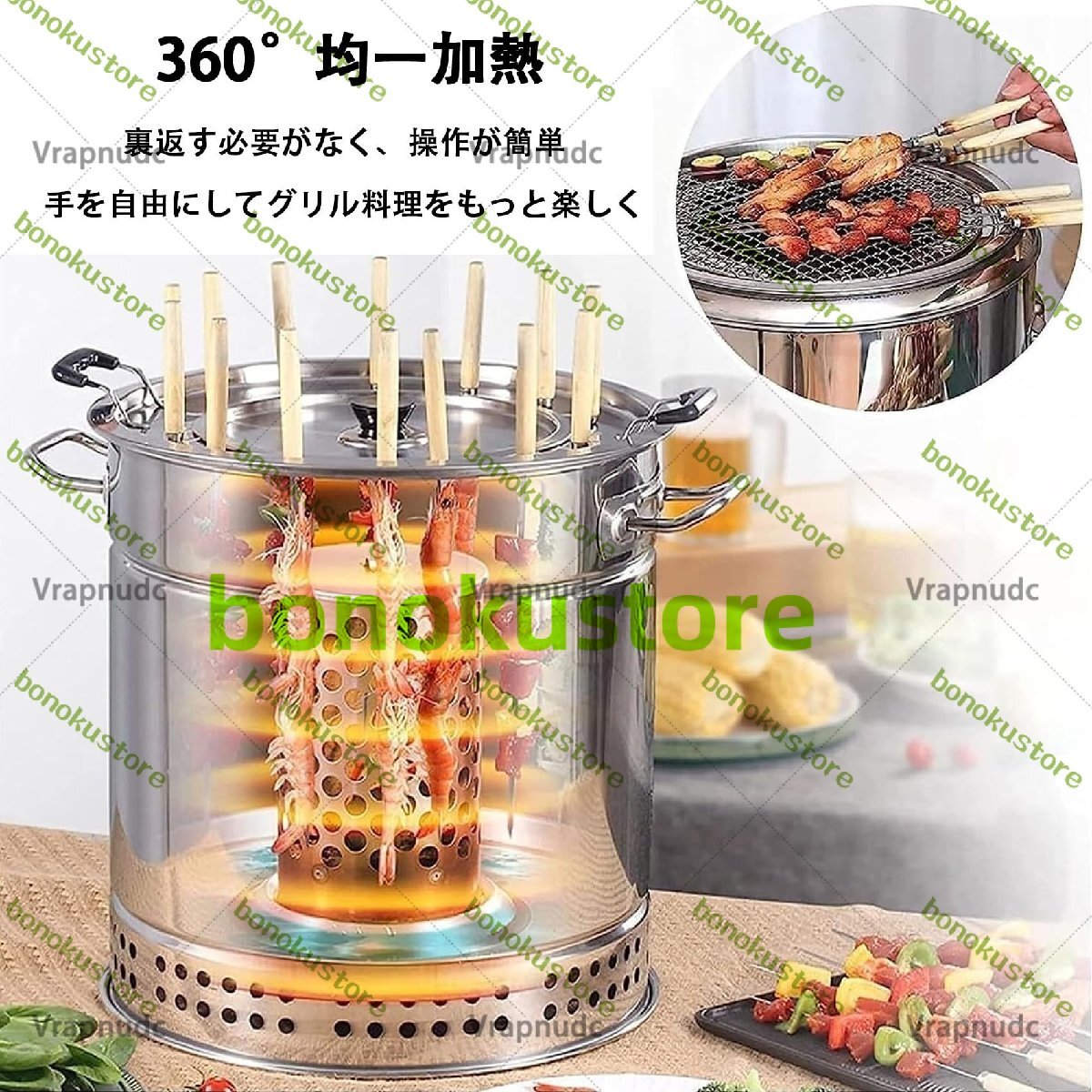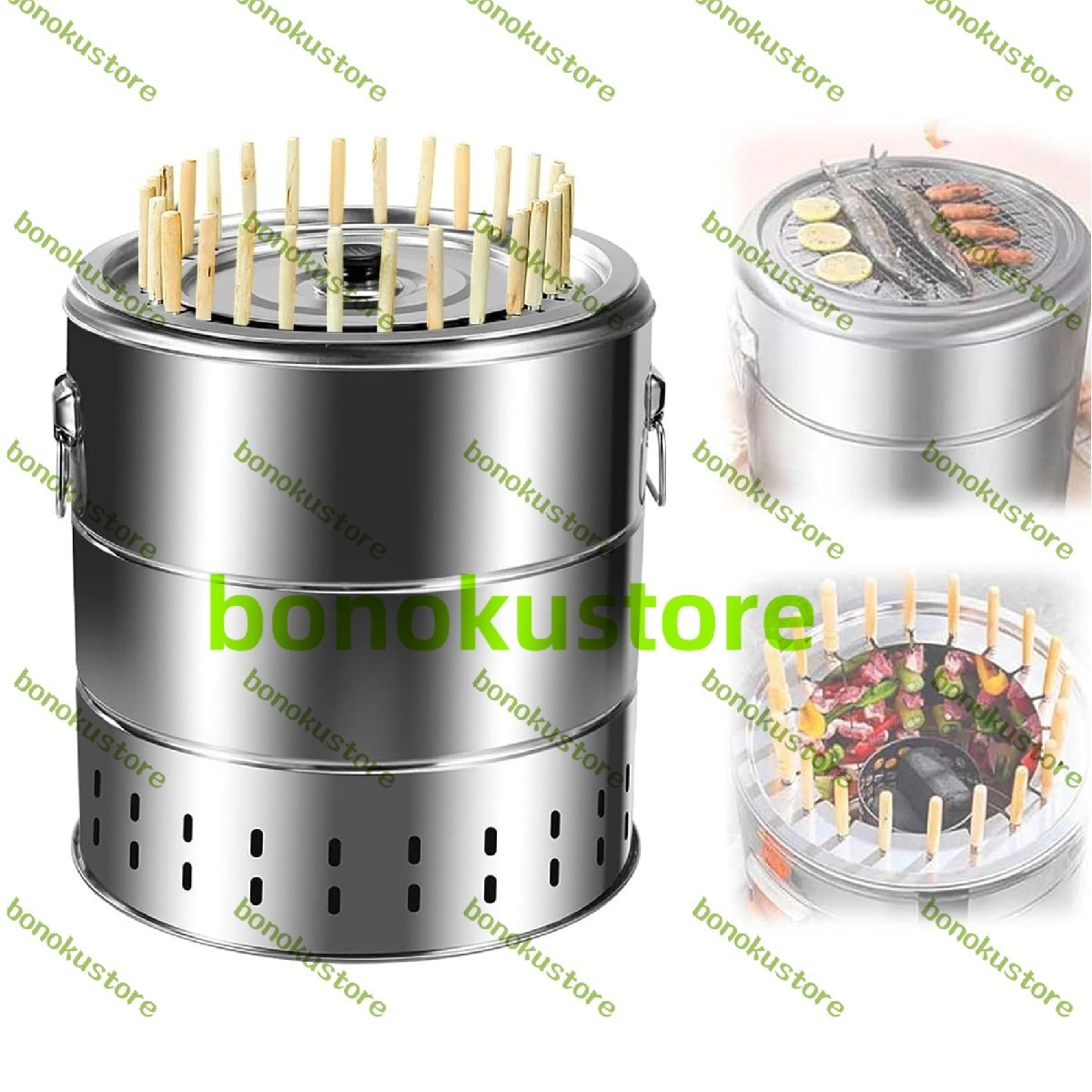 ハンギンググリル 串焼き 炭焼きグリル 樽型 BBQ 蓋付き チャコールケバブグリル ドラム型無煙バーベキューグリル 屋外バーベキューグリル一式 ステンレス製 360°均一加熱 油煙分離 キャンプやバーベキュー用 34x34*37cm
