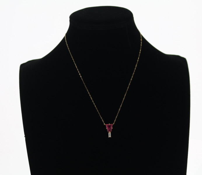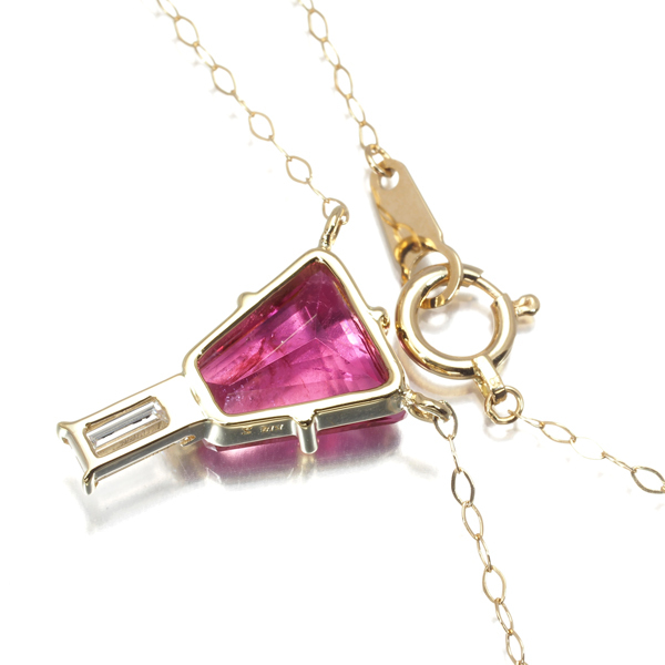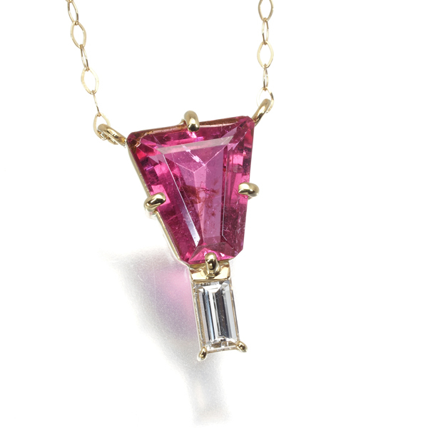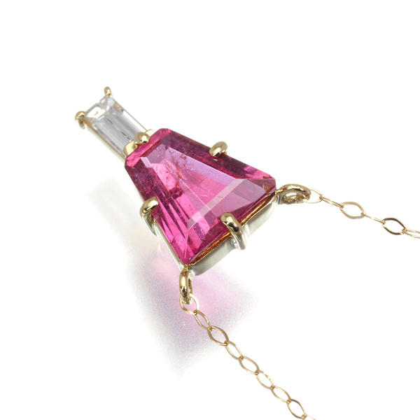 特有の内包物が多少ございますが、瑞々しい透明感溢れるピンクトルマリンの輝きを演出したネックレス。美しいカッティングが施された1石は眩いテリをも披露してくれます。下部には極上の透明感を持つバゲットカットの鮮やかな輝きを飾っておりますよ。 |