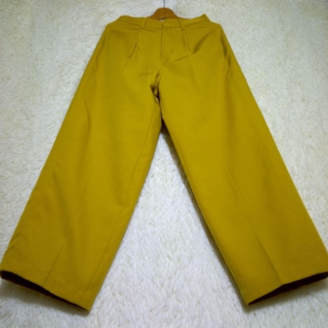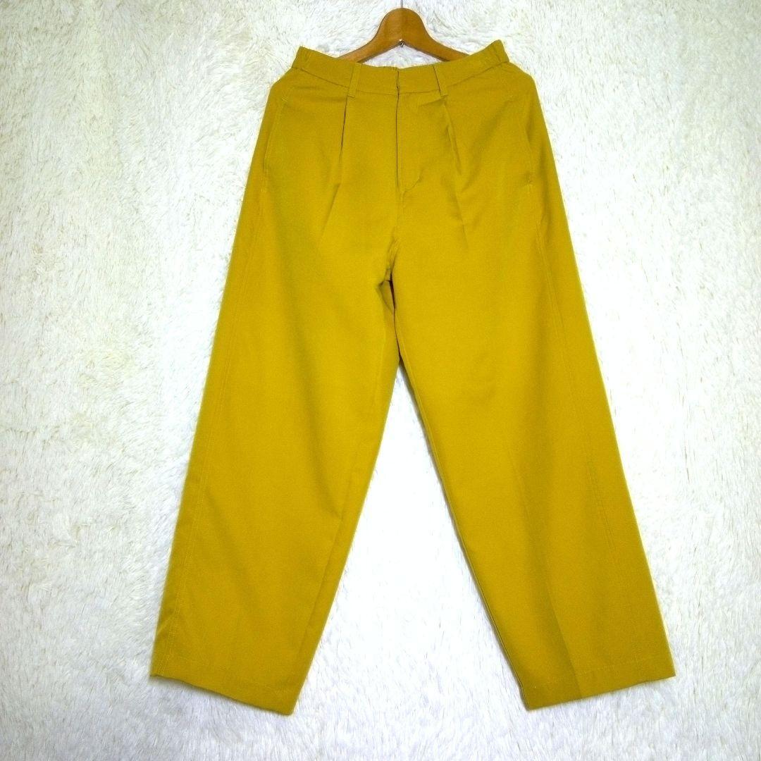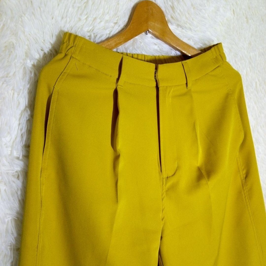 マスタードカラーのプリーツ入りワイドパンツ、ストレッチ加工で快適。
