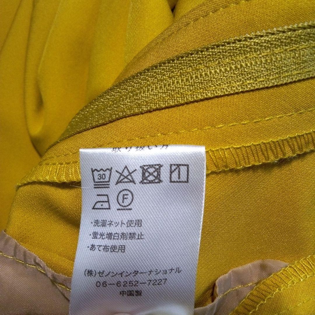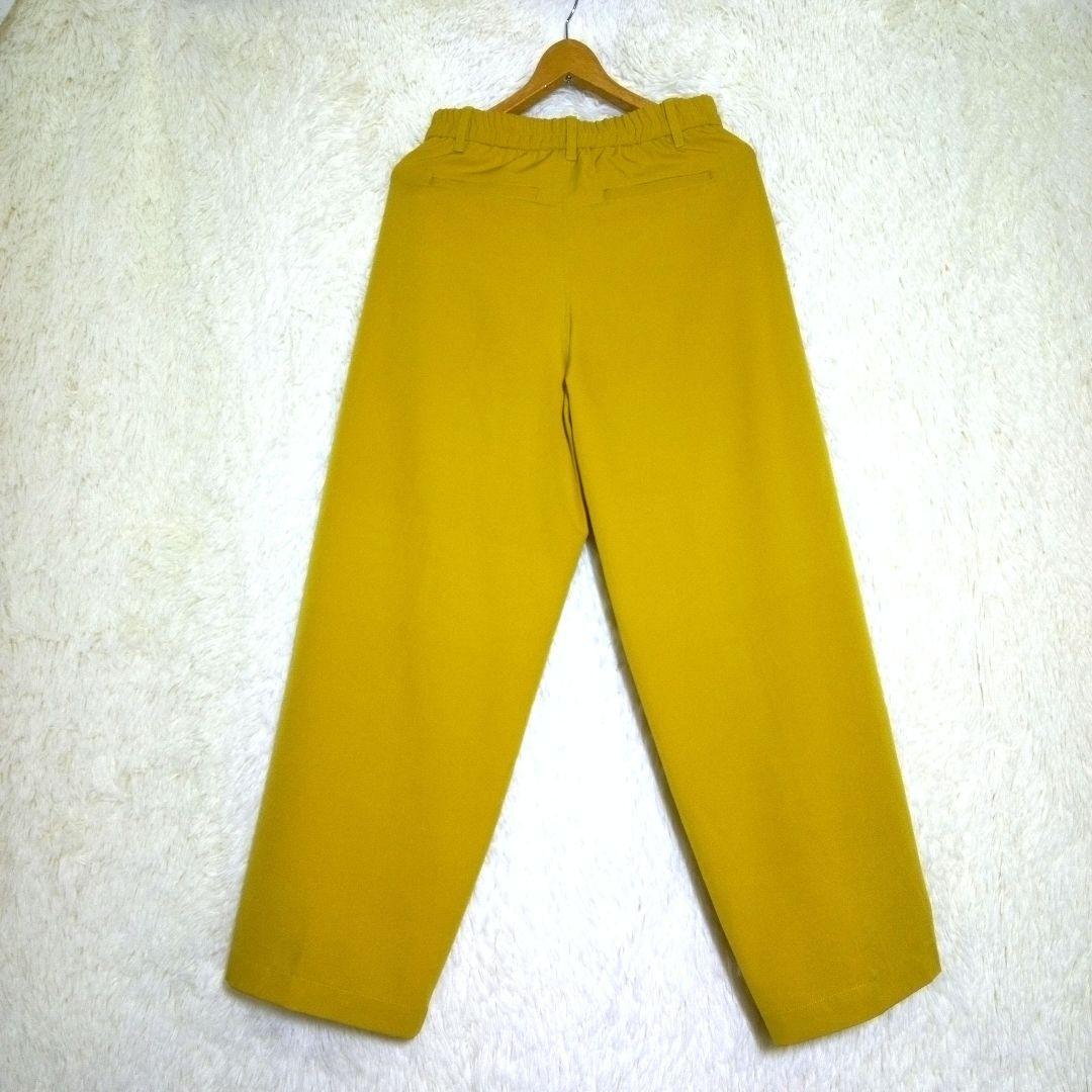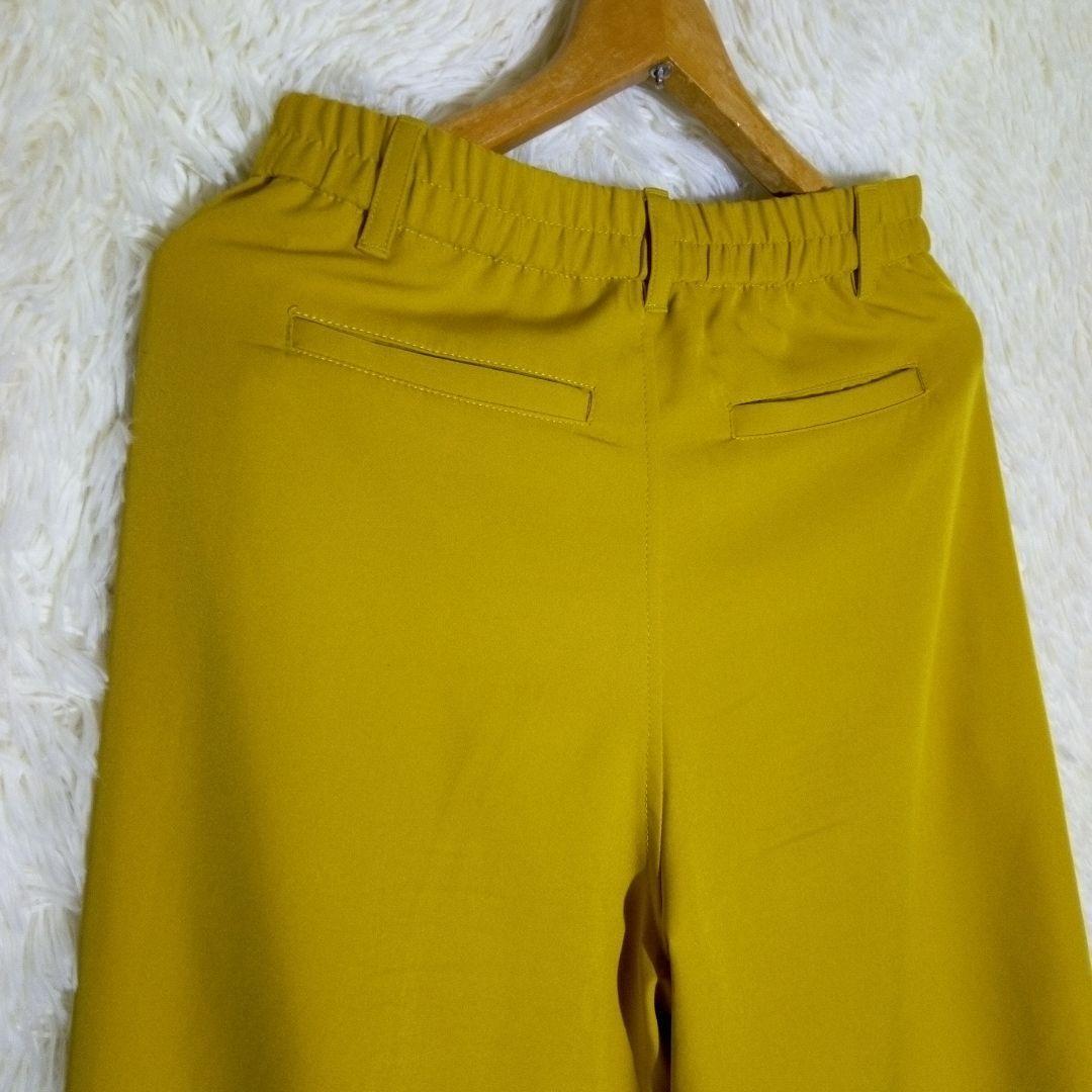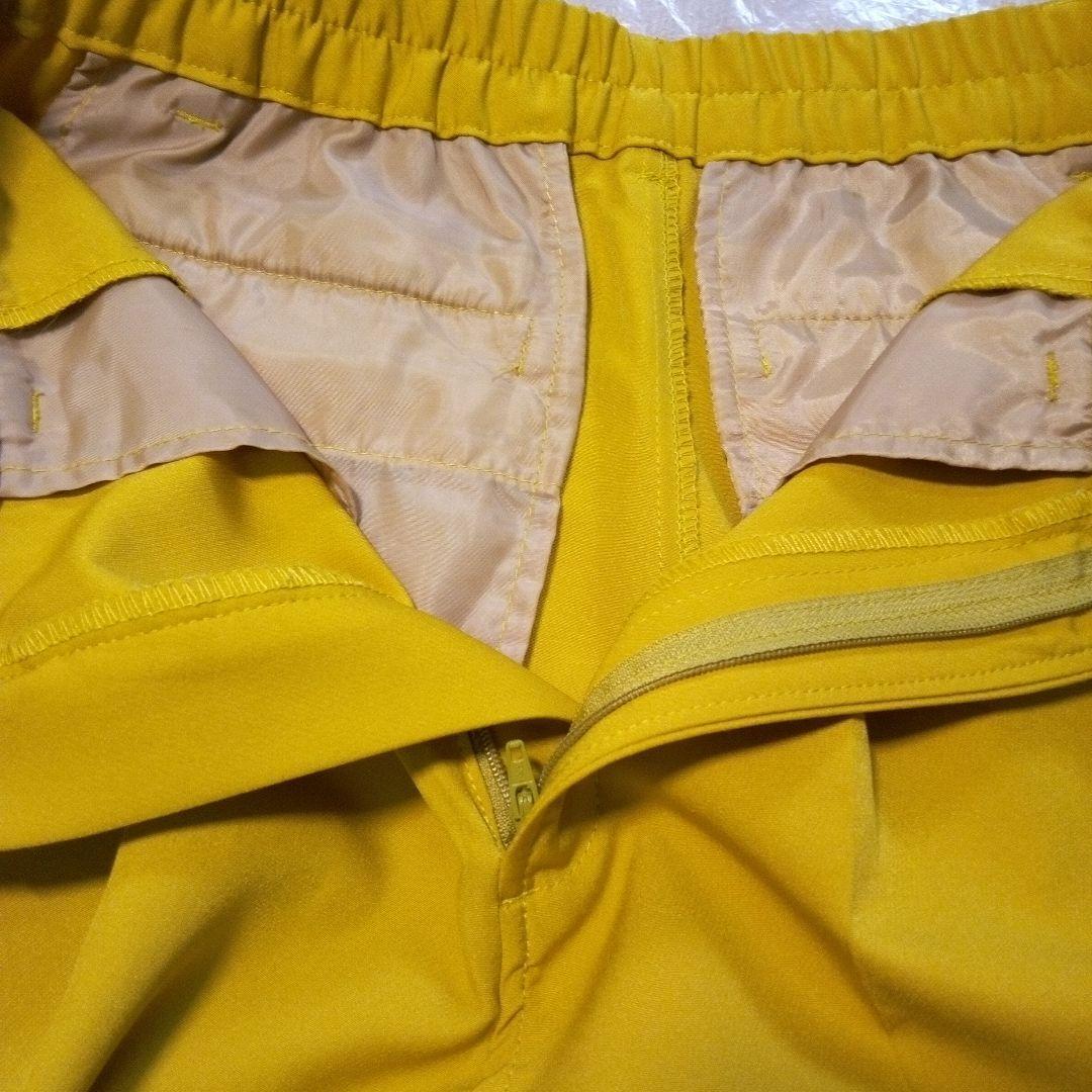 マスタードカラーのプリーツ入りワイドパンツ、ストレッチ加工で快適。