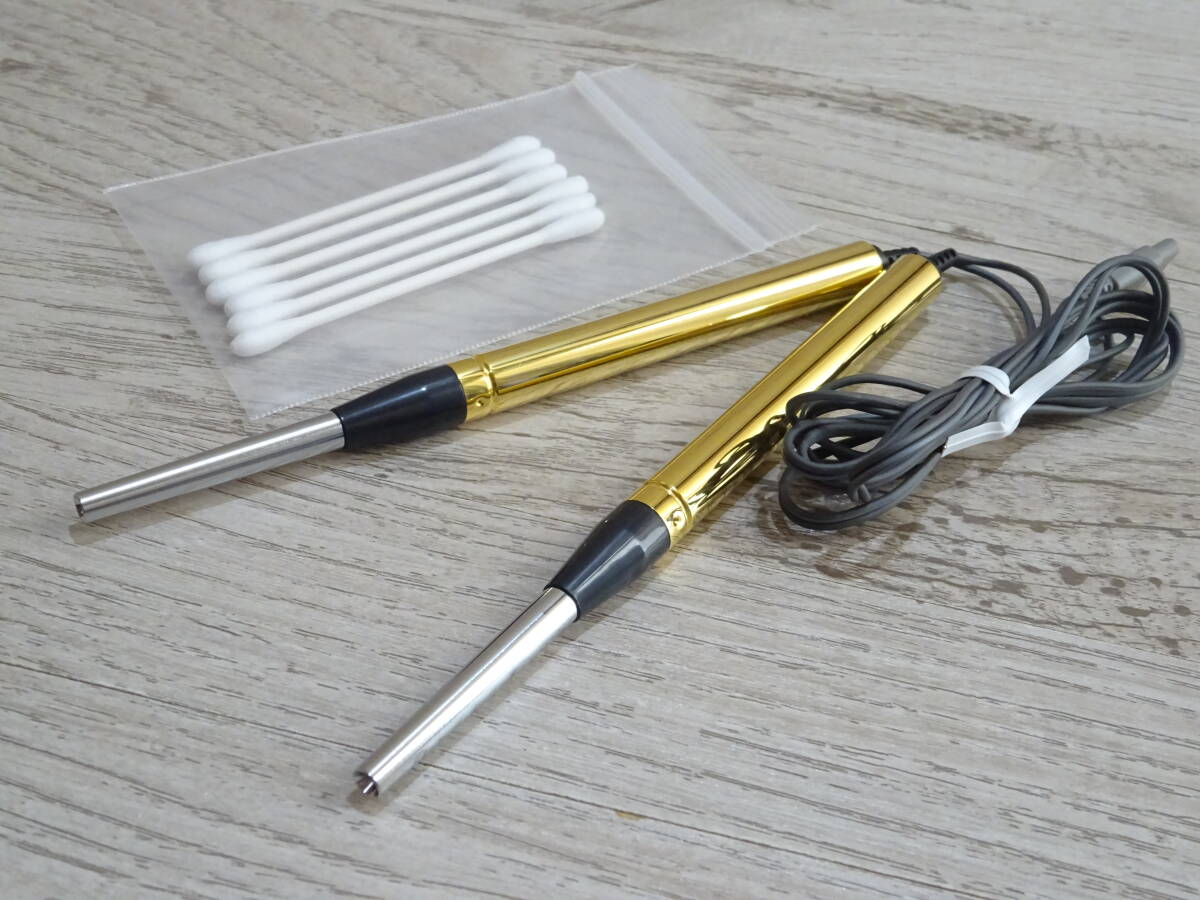 ①本体 ②接続コード×2 ③ACアダプター ④アルカリ乾電池9V型(新品)⑤マイクロカレントスティック ⑥収納袋4種 ⑦取扱説明書&サポートガイド ⑧簡単スタートガイド(COPY) ⑨綿棒