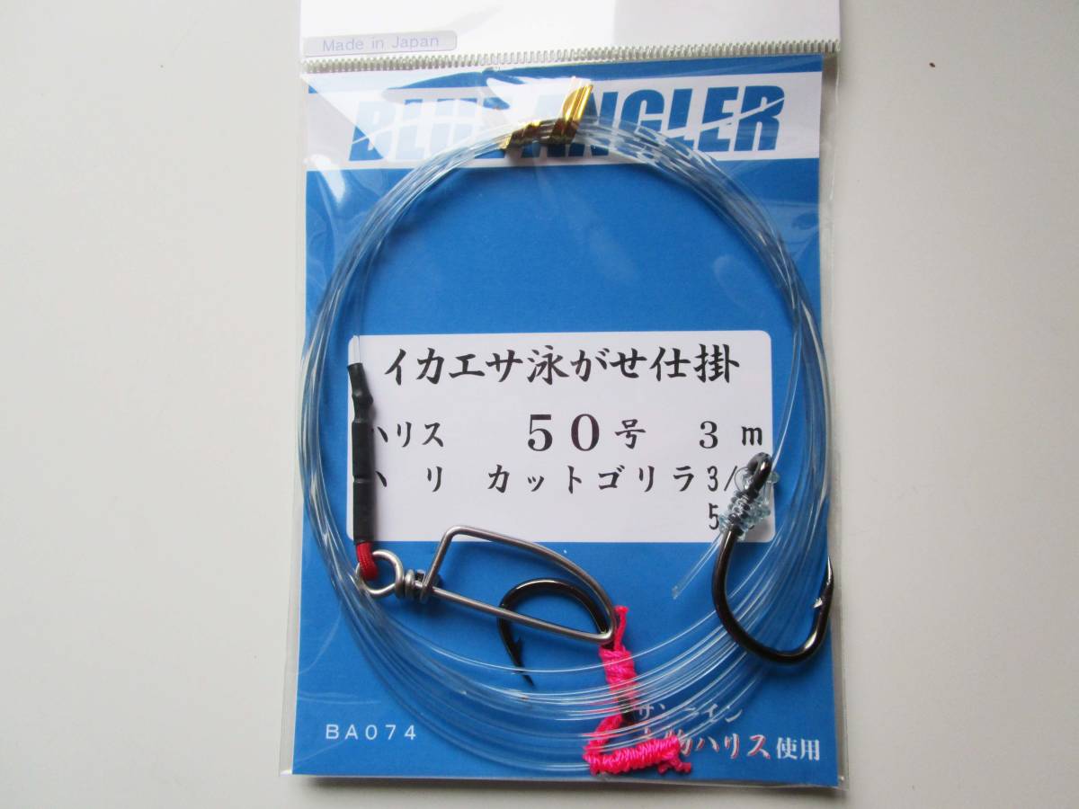 ブルーアングラー仕掛のご案内です。この仕掛は、春の大物釣り解禁時に、アカイカを餌にしてカンパチを狙う場合に使用します。餌のアカイカの大きさが様々なので、孫針が遊動し、イカの大きさに合わせられる様になっています。★孫針は安易に動かない様にやや「きつめ」に取り付けて居ります。移動方法はパッケージ裏面の説明をご覧下さい。★品名:イカエサ泳がせ50号★ハリス:ナイロン50号3m、サンライン大物ハリス使用。★ハリ:親針オーナーカットゴリラ5/0、孫針(遊動式)カットゴリラ3/0です。★親針は坂本結び、孫針はピンク糸にて編み付け遊動式。サルカンはステンファーストスナップ(ダブルスリーブ止め)です。★泳がせ用先糸(別売)と合せてご使用下さい。★発送:郵便局のクリックポストでお送り致します。★送料:全国一律185円。複数でも185円です。★このオークションは、入札した時点で落札出来る即決価格にて出品しております。他にも出品しておりますので、是非ご覧下さい。★出張等によりご連絡や発送等が出来ない場合があります。その様な場合のご連絡事項等は、自己紹介欄に記載致しますので、一度こちらをご覧下さいます様お願い致します。★以上よろしくお願い致します。