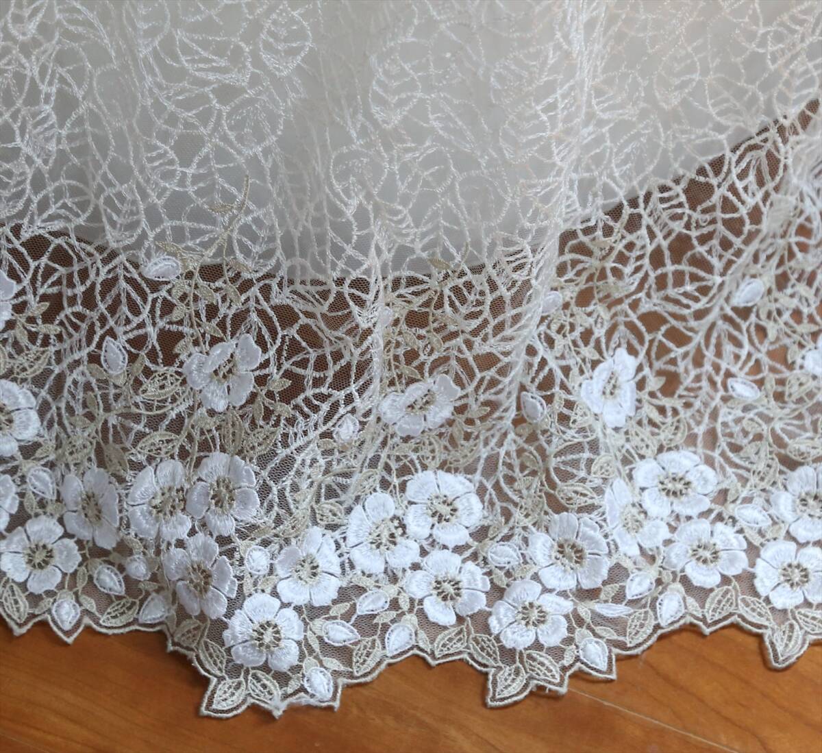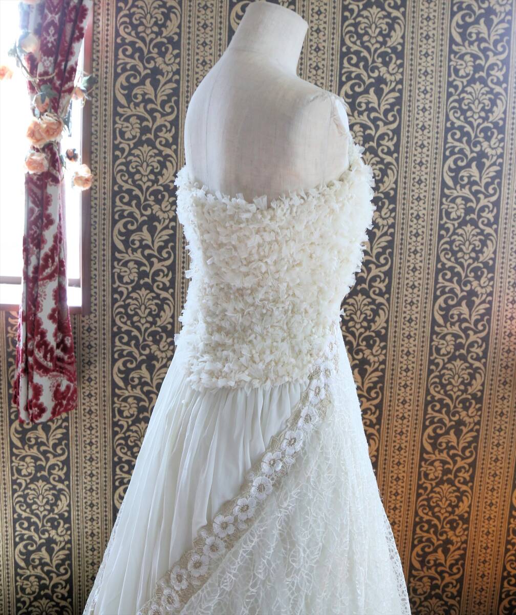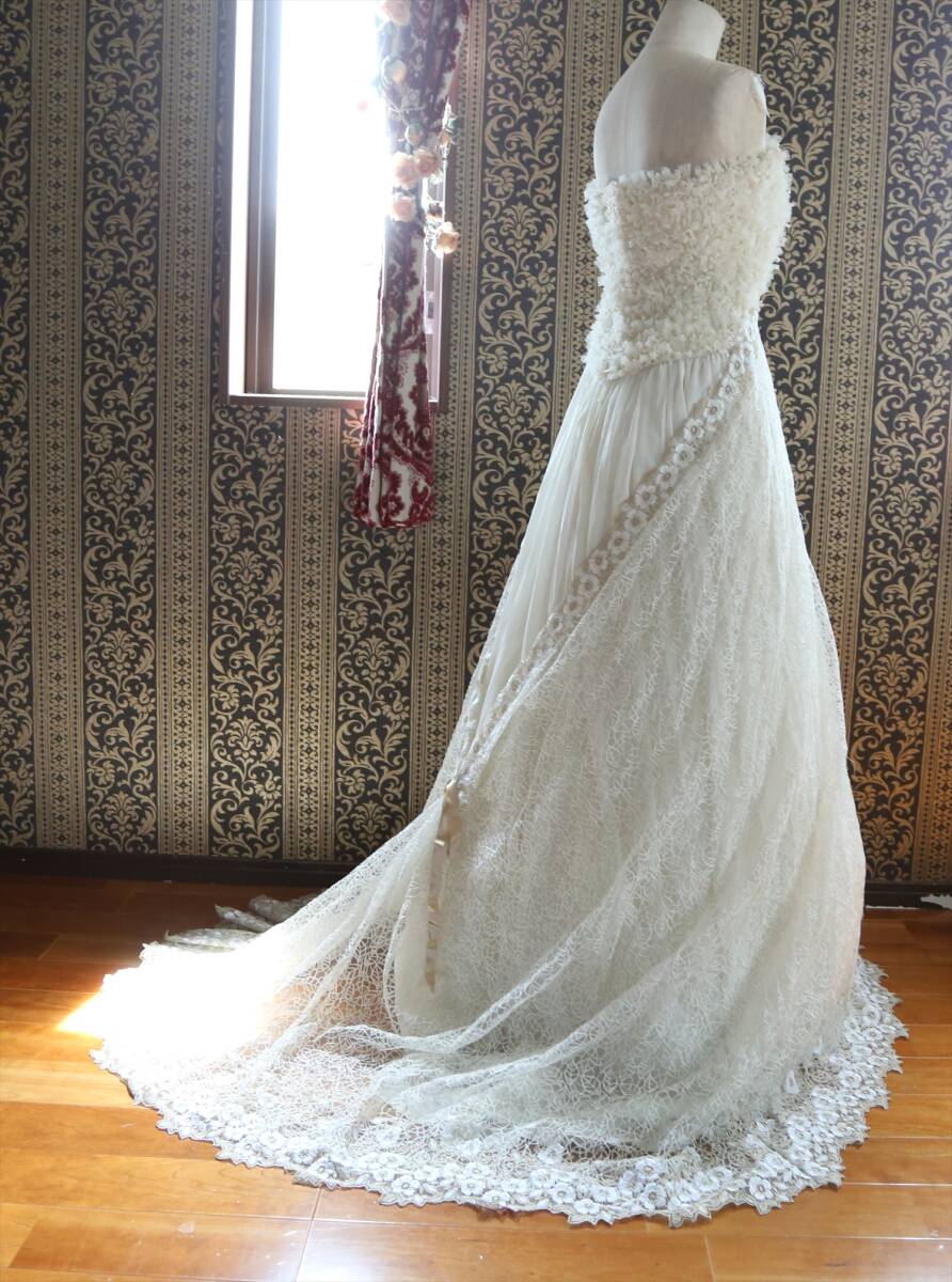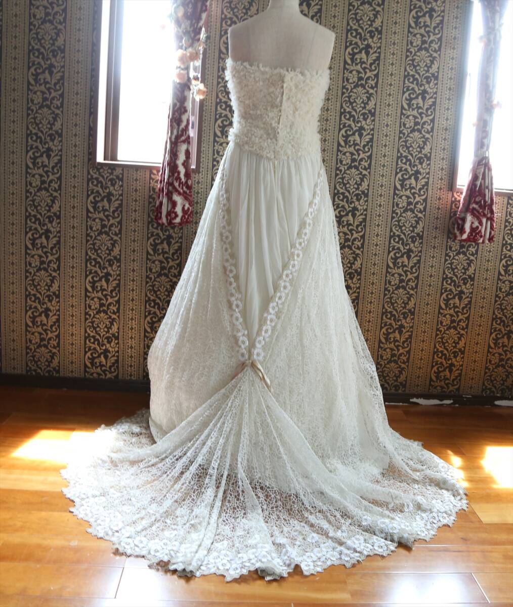 白とベージュの刺繍レース生地の重ね方も個性的で、レースの後ろ姿がとても綺麗です