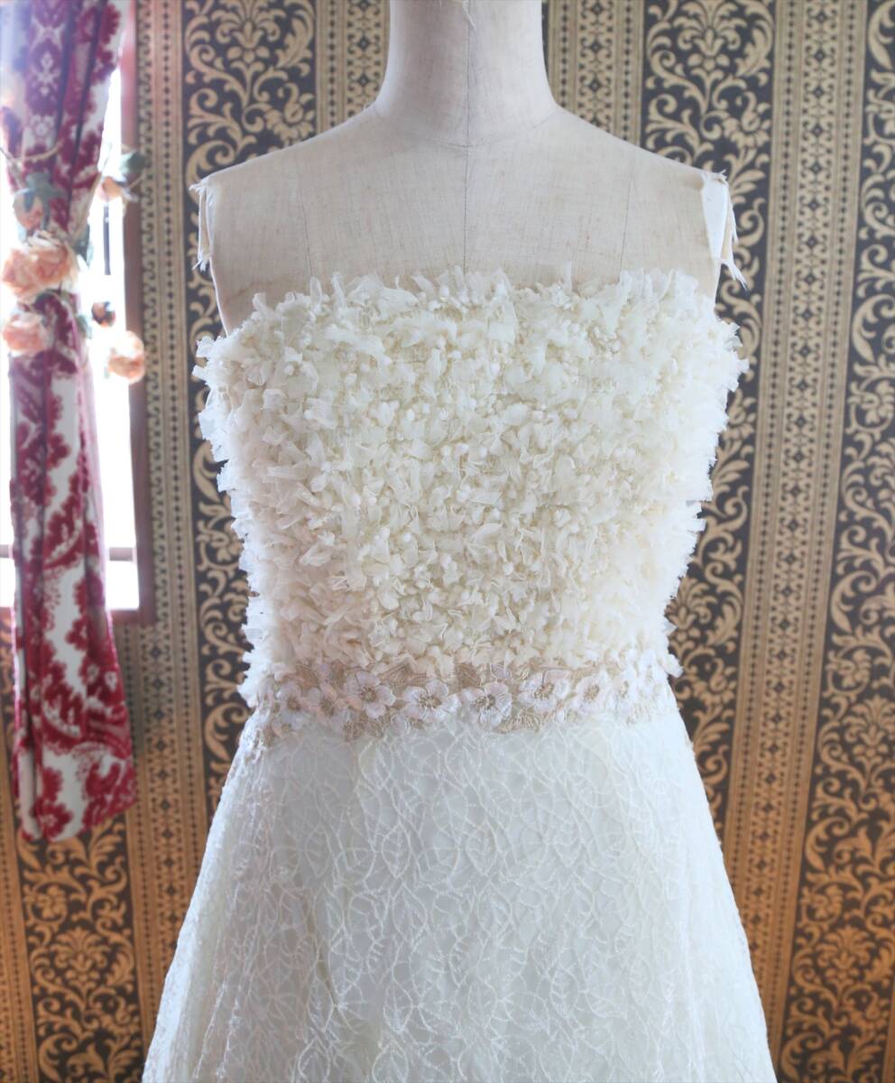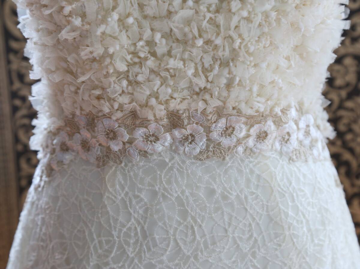 生地は上半身がチュールリボンとブークレーニットを織り込んだふんわりボリュームのある生地、スカート部分は無地のシフォン生地の上に刺繍レース生地を重ねた生地