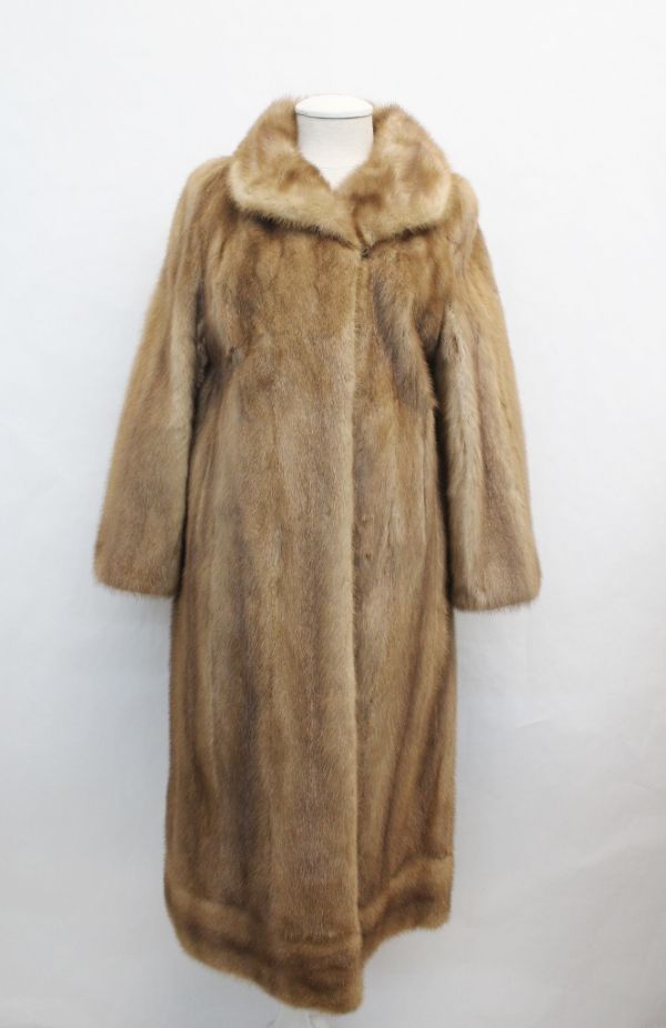 パステル・ミンク毛皮ファー・コート。ライトブラウンの艶のある毛並み。ウィングカラー。フック&アイの留め具。裾にホリゾンタル・ファーデザイン。
