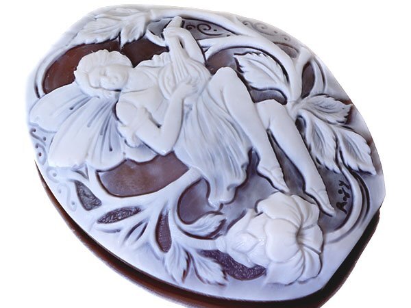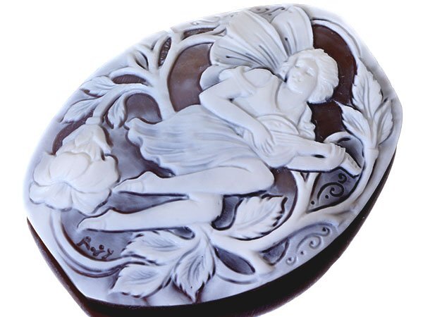 素敵な女性と花を繊細に彫刻で演出した、素晴らしい高級シェルカメオルースです!