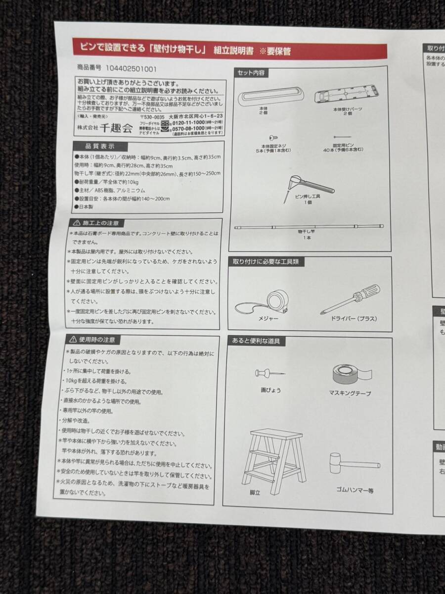 | 送料無料S93829 浮かせて干す!ピンで設置!【壁付け物干し】「物干し竿付き/室内物干し」 未使用品 未使用、保管品になります。 保管品の為、経年劣化や画像では分かりにくい小傷、スレ等がある場合があります。 画像に写っている物が全てとなります。 トラブル防止の為、神経質な方や完璧を求める方は御遠慮下さいますよう、御願い申し上げます。 | ||