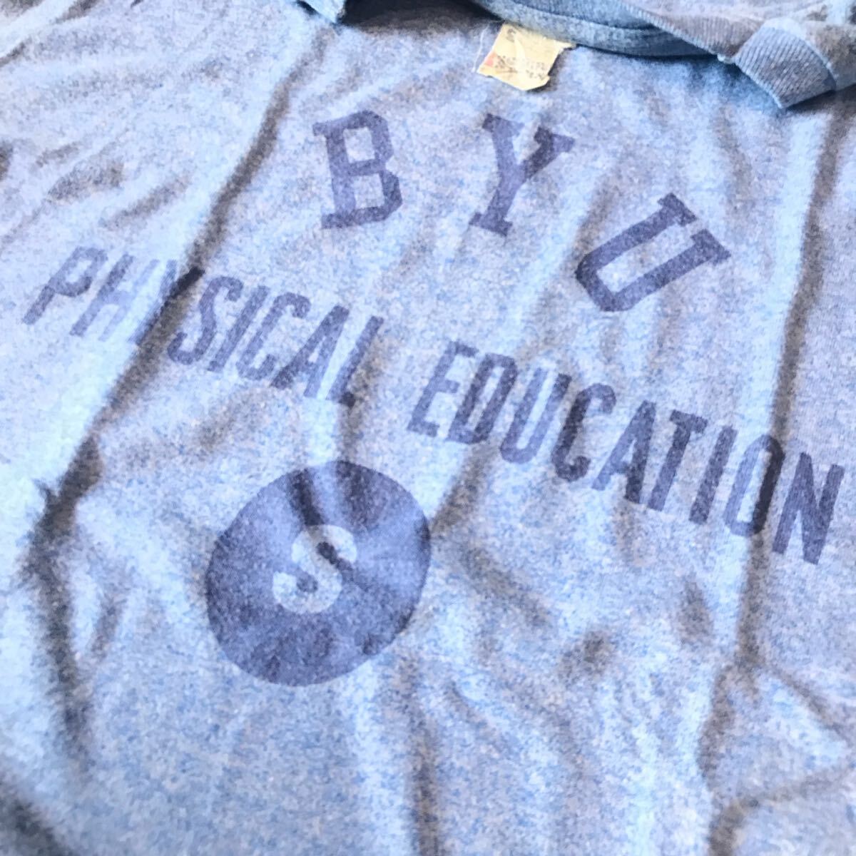 大きめのSCREEN STARSのタグが付いたBRIGHAM UNIVERSITYの染み込みTシャツになります。