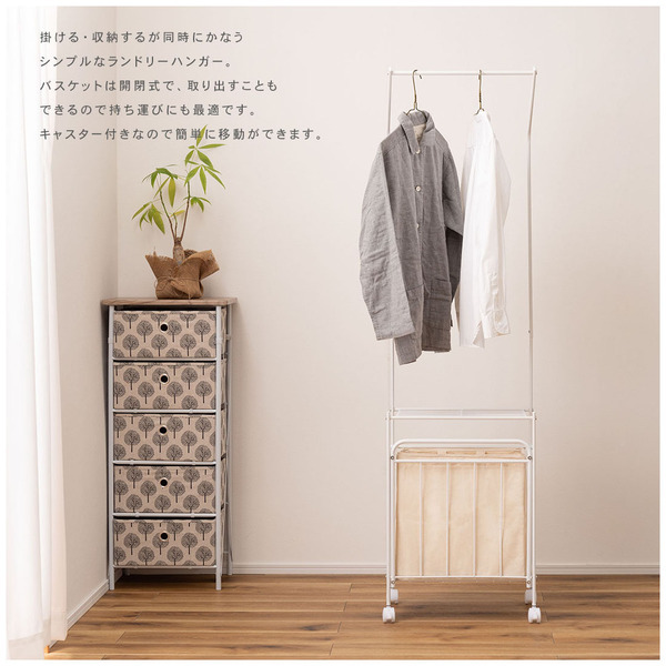 掛ける・収納するが同時にかなうシンプルなランドリーハンガー。バスケットは開閉式で取り出すこともできるので持ち運びにも最適です。キャスター付きなので簡単に移動ができます。 サイズ:W44×D30.5×H163 材質・素材:スチール(粉体塗装) ポリエステル コットン 組立式 静的耐荷重:10kg ※こちらの商品は、北海道、沖縄県及び離島へお届けできません。ランドリーハンガー キャスター付き バスケット付き 洗濯 ランドリーバスケット 洗濯物 収納 シンプル 洗濯カゴ 洗濯物入れ ホワイト 白※イメージ画像に含まれる備品等は商品に含まれません。(例:販売商品のテーブル等に合わせたチェアや敷物、カップやディシュ等)