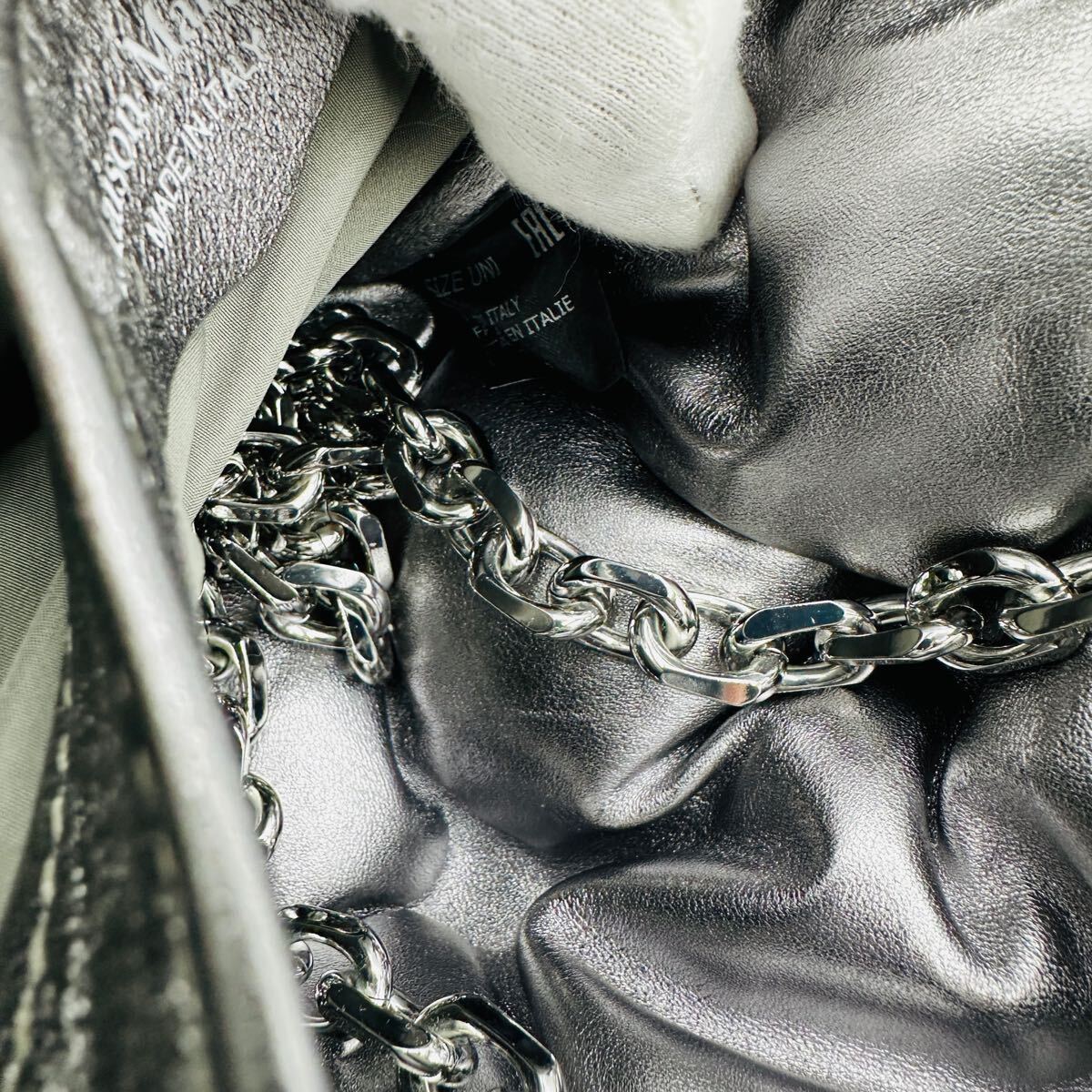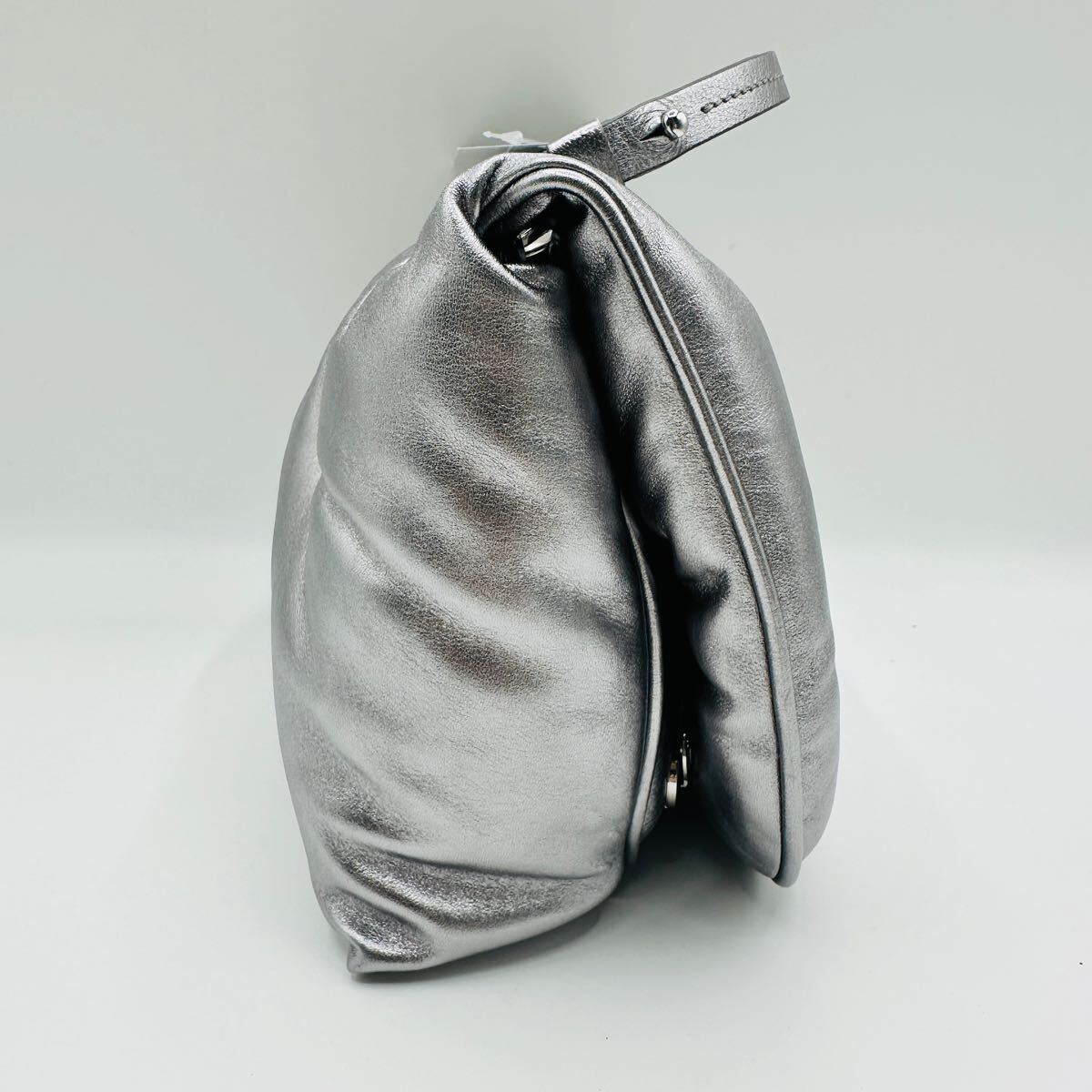 メタリックなキルティングのナッパレザーを使用した「グラム スラム」フラップスモールバッグ。2018年春夏のショーでデビューした「グラム スラム」は、フランスのマルセイユで生まれた手縫いのキルト「マテラッセ」スタイルを模したキルティングデザイン。そのコンセプトは、メゾンが世界中で服装や旅行に関する習慣を研究した後に得た「無意識下の魅力」という概念を思い起こさせ、安らぎを感じさせます。ショルダーチェーンとトップハンドル付き。フロントにナンバリング ロゴのラベルがあしらわれています。